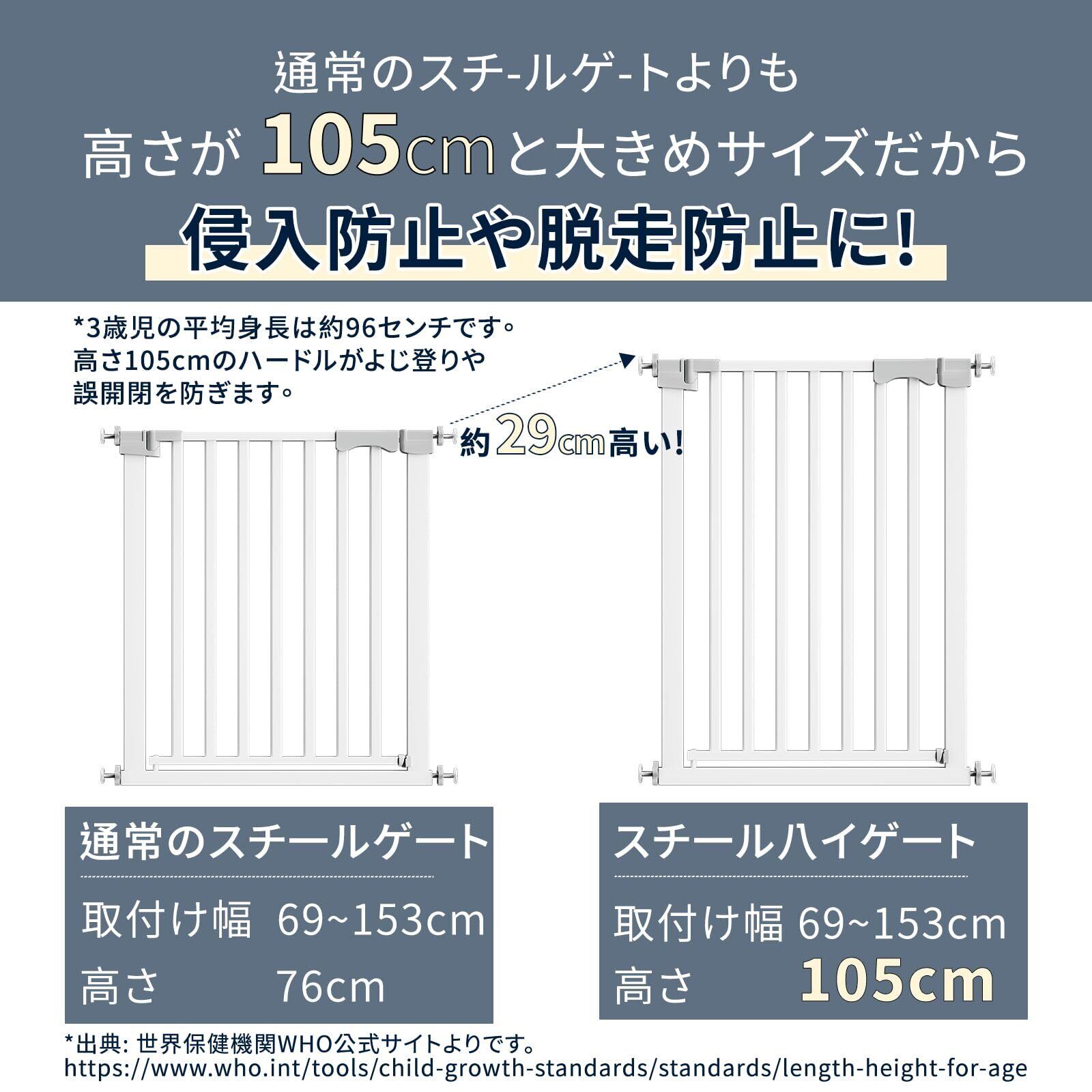 【105cmハイタイプ:成長期の子供&飛び越えペットを徹底ブロック】 従来比+29cmの高さ(105cm)で、2〜3歳の子供のよじ登りや中型犬の飛び越えを防止。2cm楕円バー&5.5cm密間隔で指詰まり/すり抜け対策も強化!