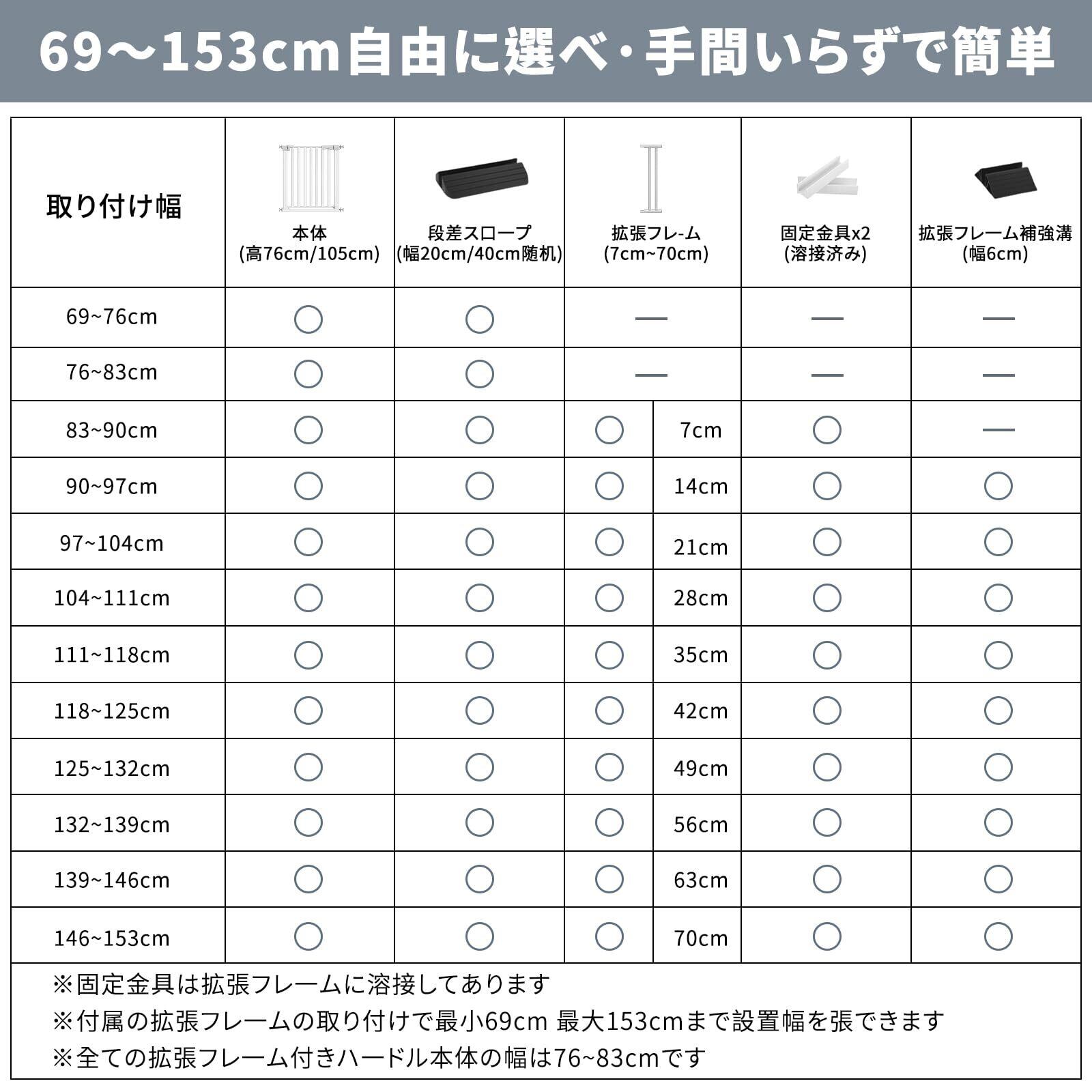 【全幅153cm&全配件付属:キッチン/螺旋階段に最適】 拡張フレーム(7-70cm)付属で幅69〜153cm柔軟調整。「段差スロープ」「補強溝(90cm以上付き)」「溶接固定金具(溶接は延長)」を全付属。柱状階段にはY型ボルト(別売)で確実設置。