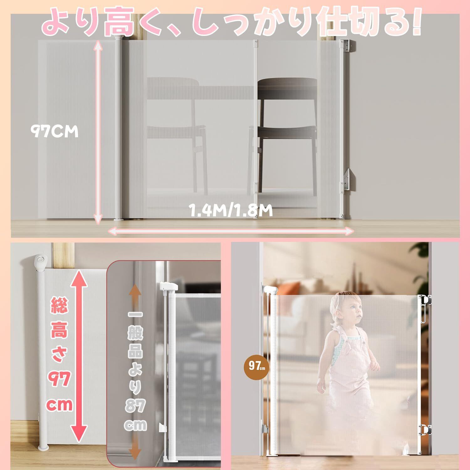 【Dzannc】ロール式ベビーゲート – 自動巻き取り&安全ロック搭載、豊富なサイズ展開、ネジ&粘着取付対応、ペット(犬・猫)対応、日語説明書付、室内安全対策 (ホワイト, 97*140cm)
