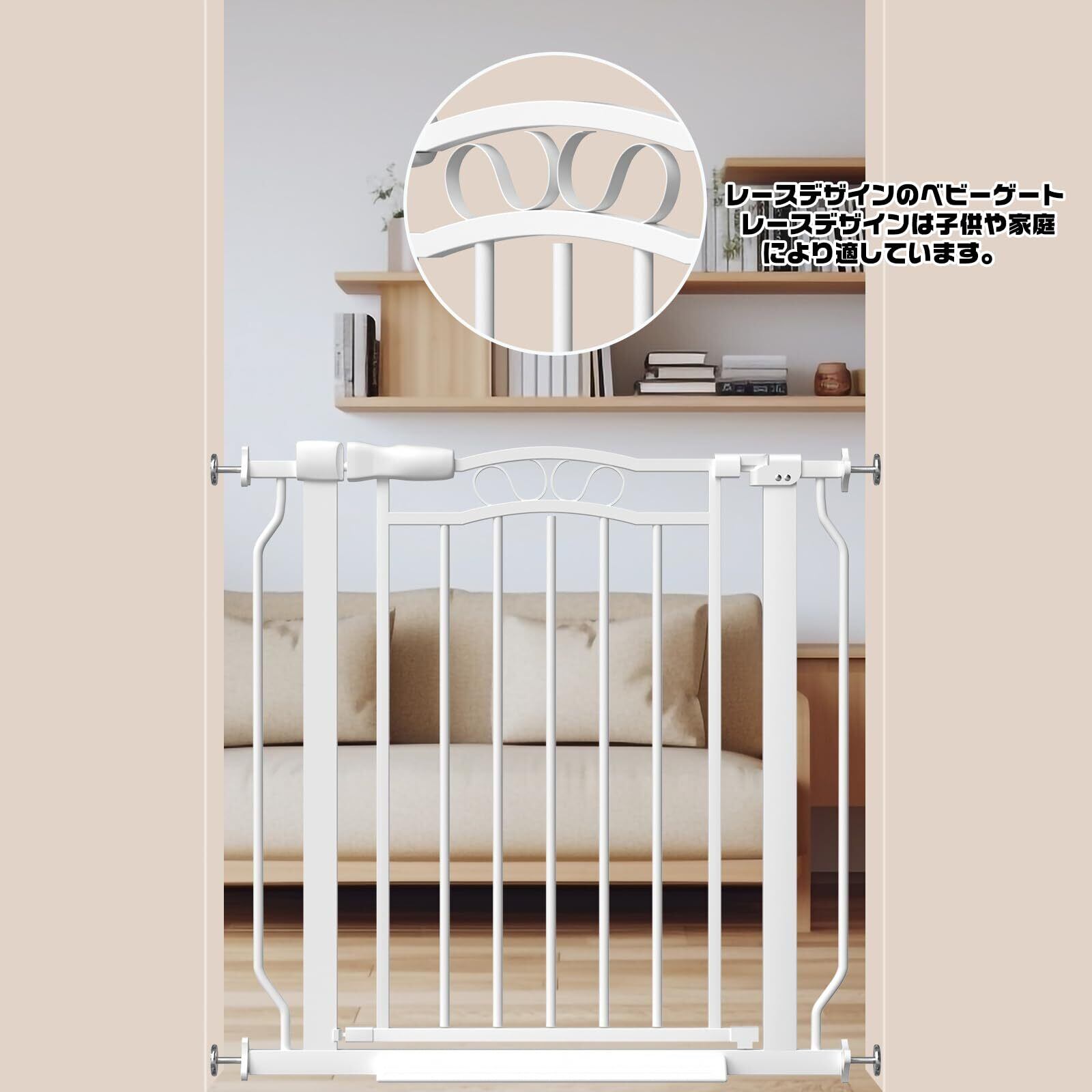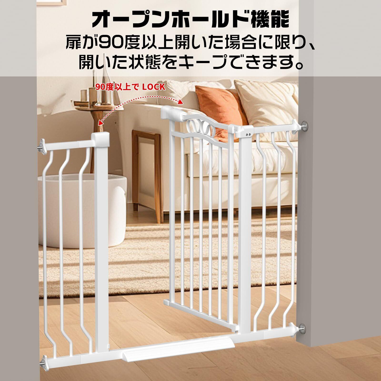 オートクローズと前後両開き:ベビーゲートはドアを90度以上開けるとその状態をキープし、90度未満の場合は手を離すと自動で閉まりロックもかかるオートクローズ機能を搭載しています。ベビーゲートは前後どちらからでも開閉でき、通行のストレスを軽減します。ベビーゲートを閉め忘れる心配もなく、自動で閉まりロックがかかることができます。