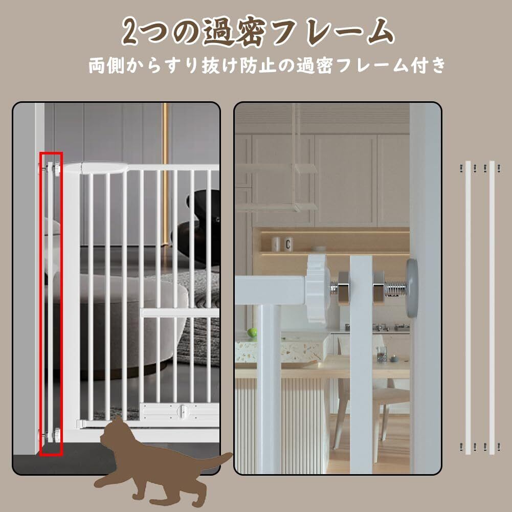 【3.5cm柵間隔&過密フレーム付き】柵の間隔は3.5cmで、小さなペットや子猫がすり抜け防止ことができる。そして最大限のサイズをご利用する場合は、安全性を高めるために両側からすり抜け防止の過密フレームを取り付けします。2つの過密フレームを使用すると、ドアの隙間を狭めることができます。猫用ゲートに最適の選択です。