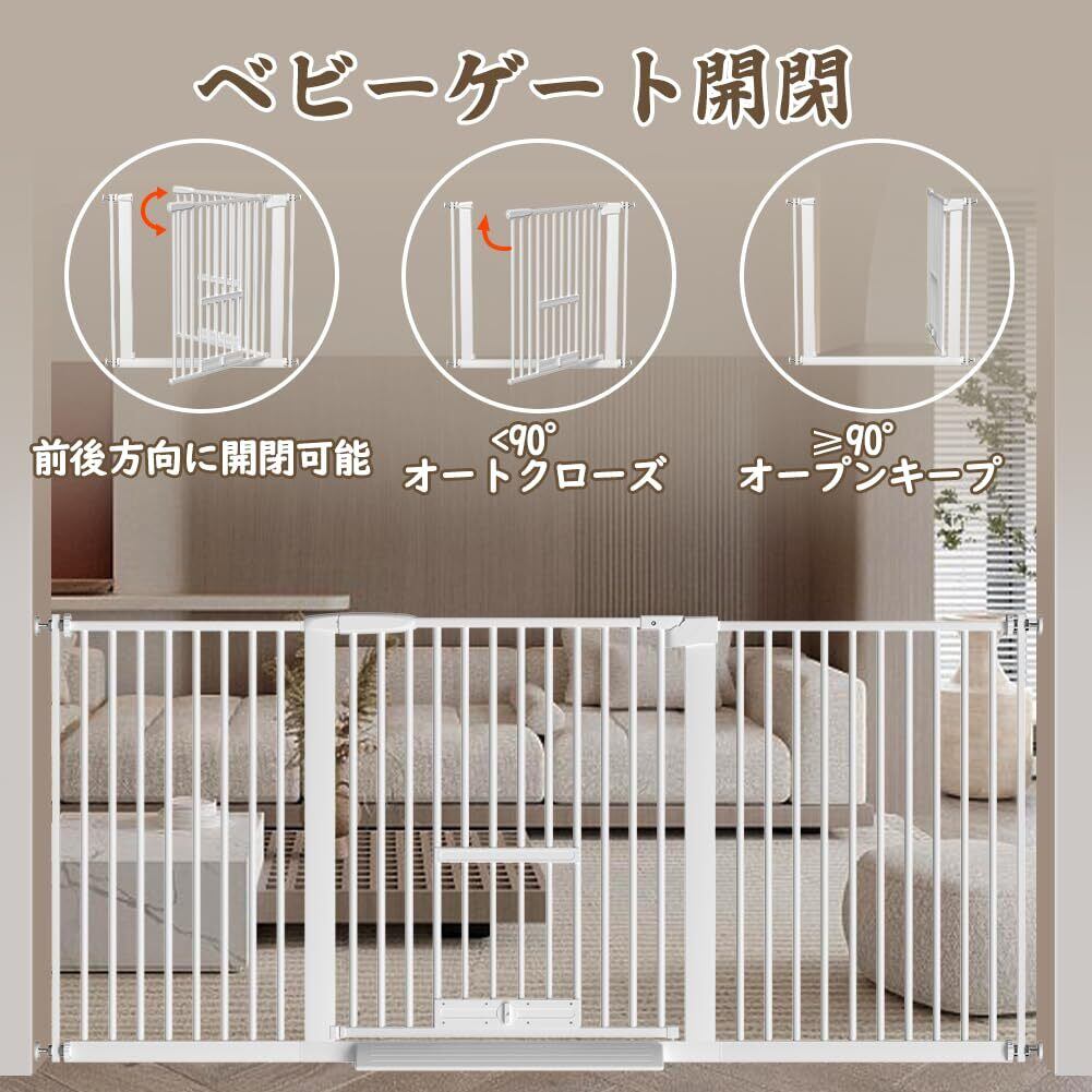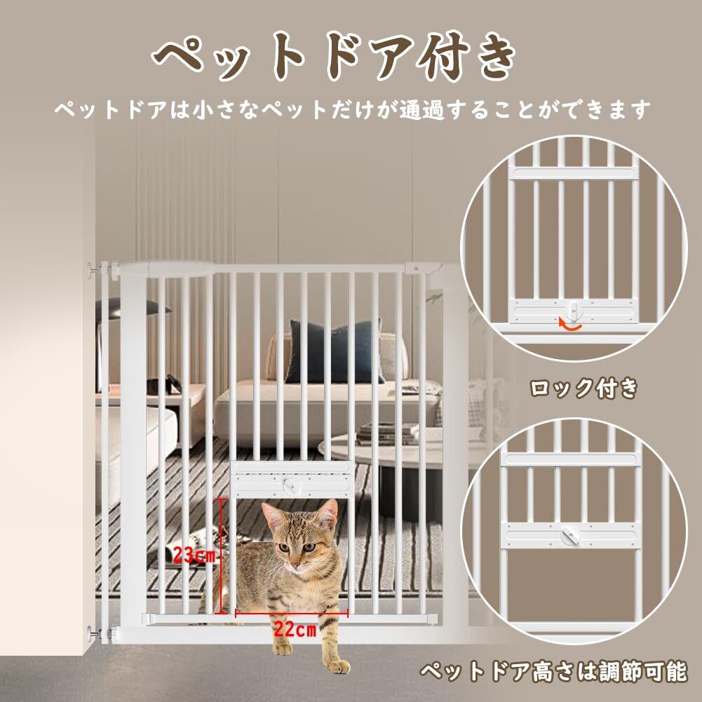 【ペットドア付き】ペットゲートには猫や小型ペットの出入りに便利な小さなドアが付いています。23*22cmのペットドアは小さなペットを通過させることができ、同時に大きなペットを外に遮り、犬がキャットフードや猫用トイレに触れないようにすることができます。この小さなペットドアが開く高さは調節して固定することができます。ロック機能を含む、赤ちゃんとペットがいる家庭にやさしいゲートです。