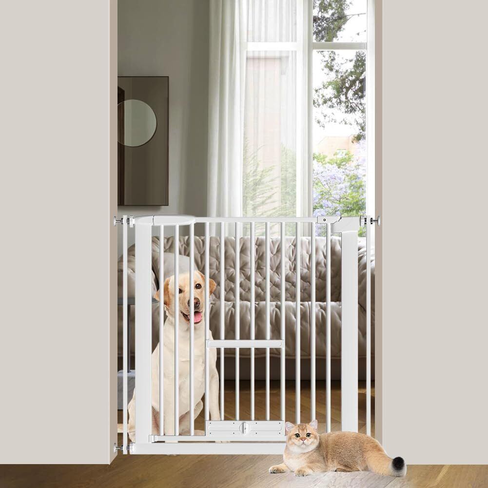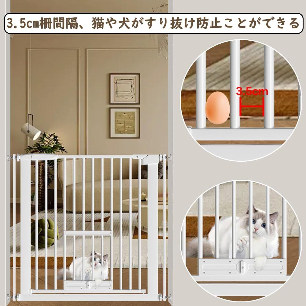 Seogva ペットゲート 3.5cm柵間隔 ペットドア付き 高さ78cm ペットゲート 犬 猫 ゲート ブラック ホワイト 猫用ゲート 過密フレーム付き 猫 ゲート 犬すり抜け防止フェンス つっぱり 扉付き 赤ちゃん ベビーゲート 突っ張り式 自動ロック 階段上 (設置幅76-86cm、ホワイト)