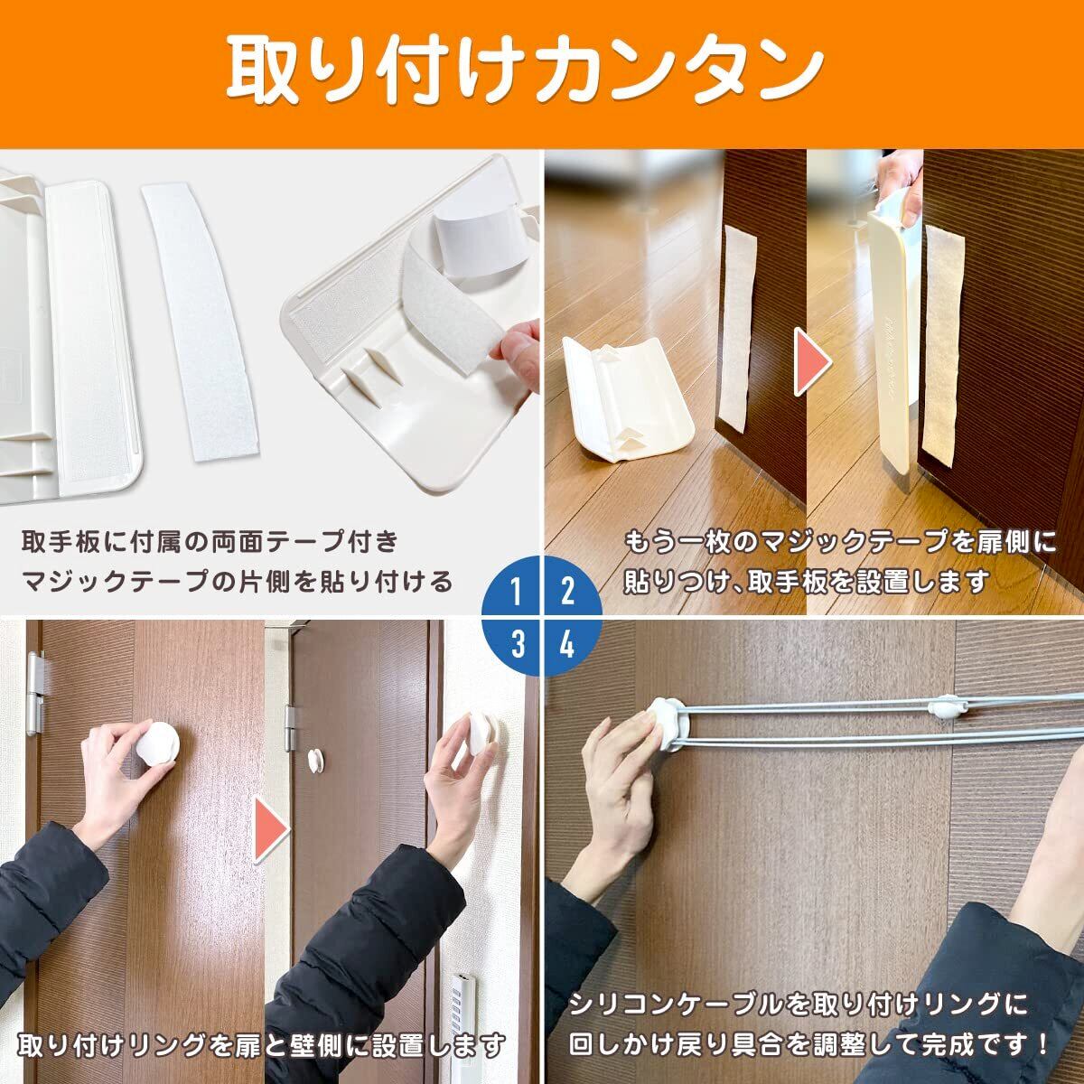 ※ケーブルを使用した状態ではドアを閉めても1cm-2cmの隙間ができます。使用しない場合は取り外してください。 ※取っ手板はペットの目線の高さに取り付けが必要です。 ※壁に接する側や扉の開き方向には取り付けできませんのでご注意ください。 ※両面テープは強粘着です。はがす際に壁やドアが傷つく可能性がありますのでご注意ください。