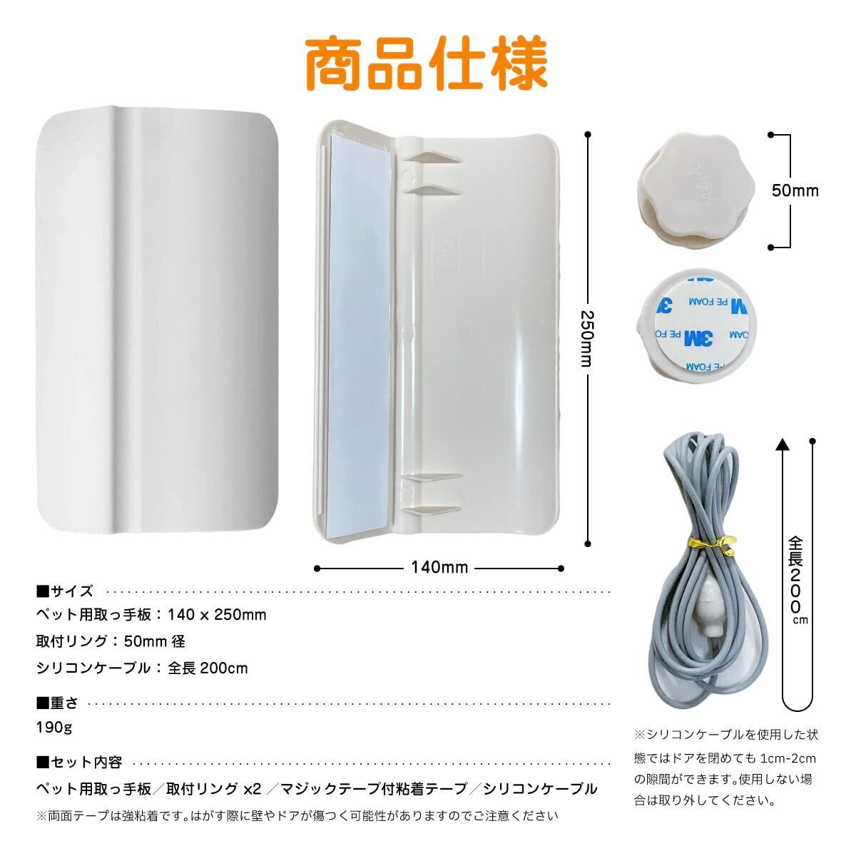 【商品仕様】◇サイズ ペット用取っ手板:140×250mm、取付リング:50mm径、シリコンケーブル:全長200cm ◇重さ:190g ◇セット内容 ペット用取っ手板/取付リング ×2/マジックテープ付粘着テープ/シリコンケーブル