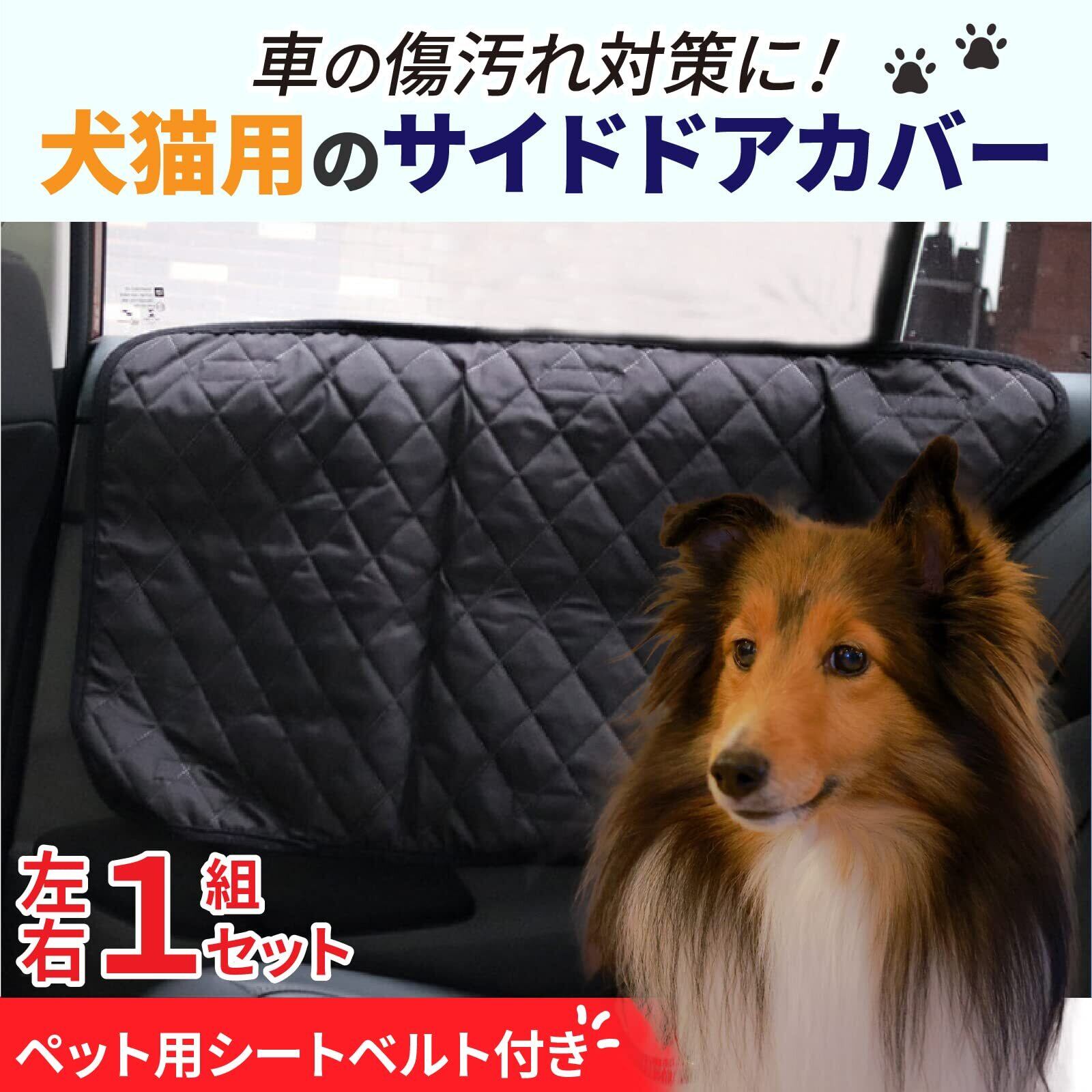 車にペットを乗せて移動するときの傷汚れ対策に!犬猫用のサイドドアカバーです。左右一組セット、ペット用シートベルト付き。ドアを傷から守れるため、犬や猫と気軽にドライブに行けます。