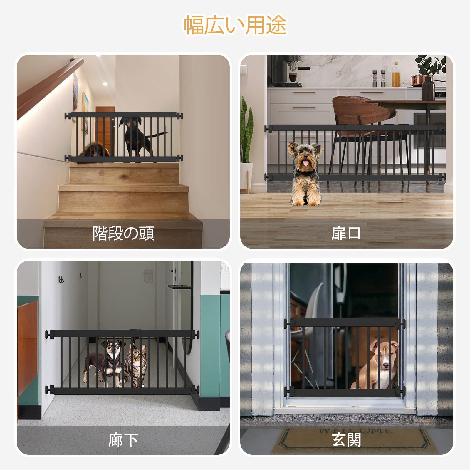 【幅広いペットゲート】ペットゲートは設置幅45cm-115cm,リビングルーム、部屋、バルコニー、階段、キッチン、ベッドルーム、バスルームで広く使用されています。ペットに入って欲しくない場所の仕切りに最適なペット ゲートで.