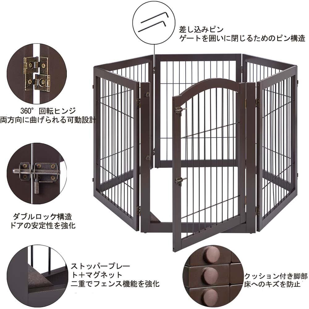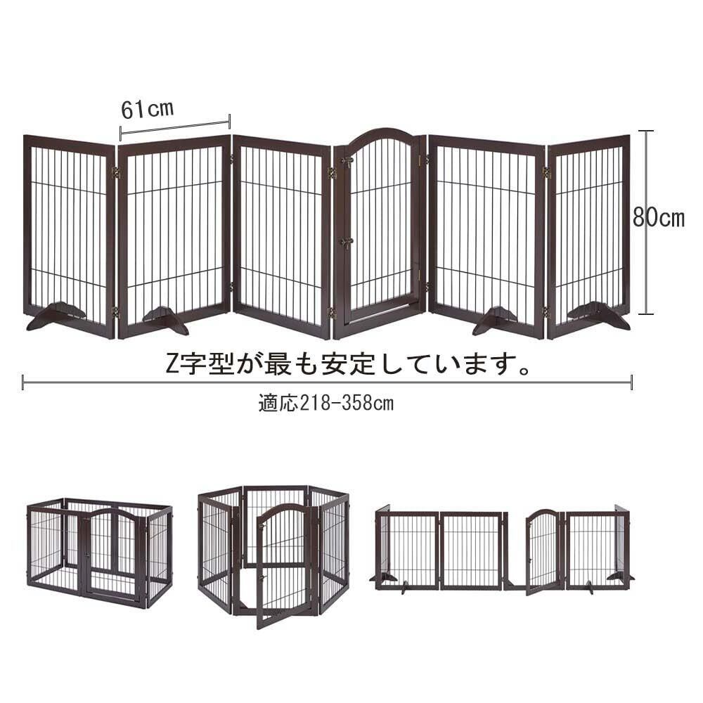 unipaws ペットフェンス 置くだけ簡単 ペットゲート 木製 折りたたみ式 ドア付き 伸縮可能(幅218-358cm 高さ80cm)ブラウン 自立式 6枚パネル