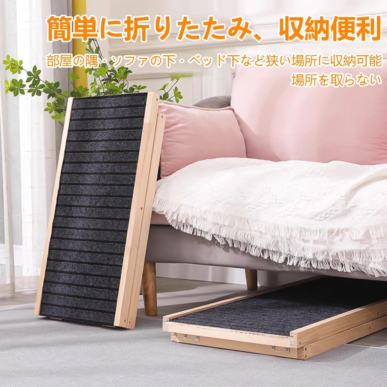 【折りたたみ可能で持ち運び便利】:当社のペットスロープは2段階の高さ調節が可能(①32cm/②42cm)。お好みに合わせて高さを調整し、ペットのベッド・ソファ・車の乗り降りをサポートします。折りたたみ設計で収納も楽々。車のトランクやソファ・ベッドの下にコンパクトに収められます。