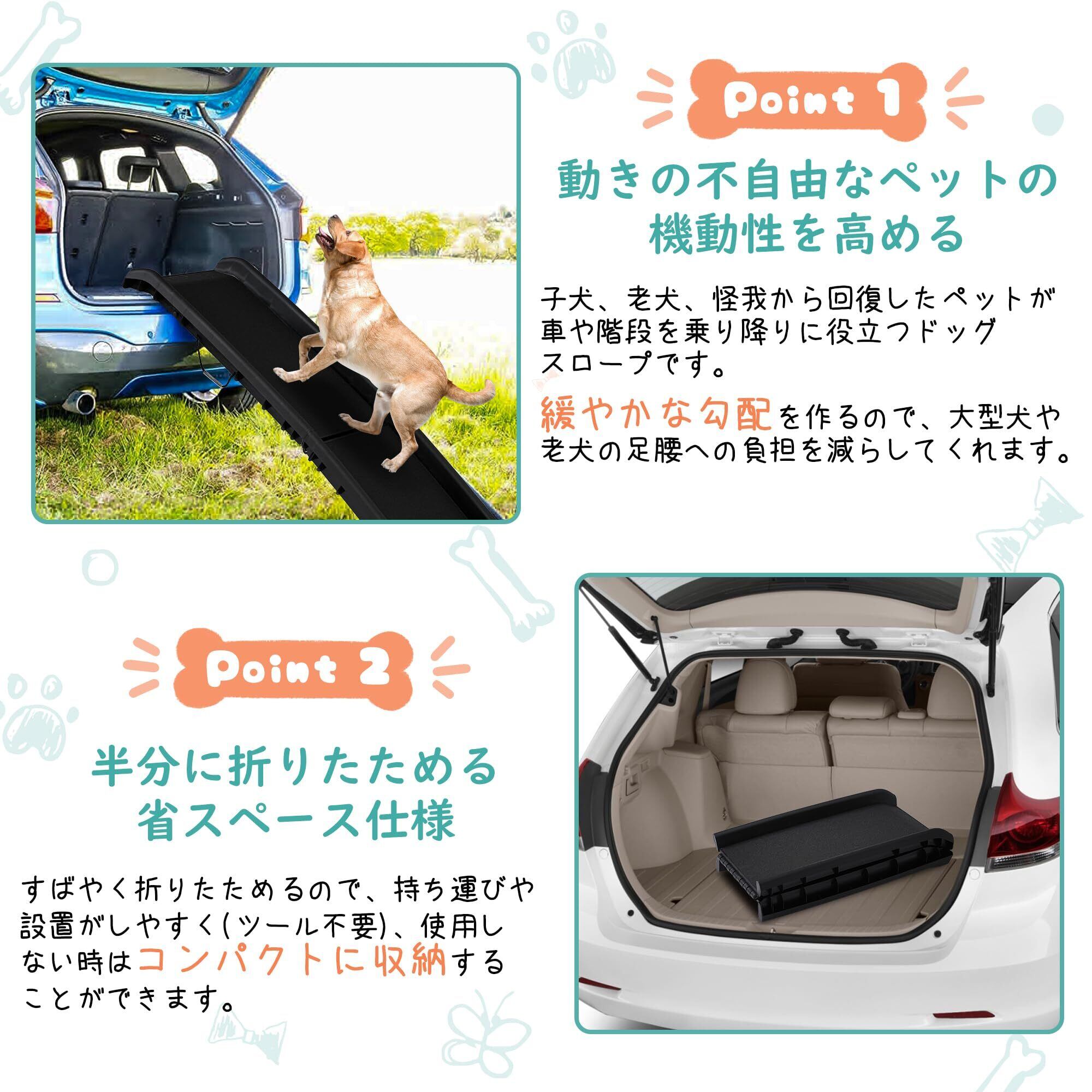 【動きの不自由なペットの機動性を高める】子犬、老犬、怪我から回復したペットが車や階段を乗り降りに役立つドッグスロープです。緩やかな勾配を作るので、大型犬や老犬の足腰への負担を減らしてくれます。ペットを持ち上げなくてよいので、飼い主の負担を軽くできます。ワンちゃんだけでなく腰を痛めている飼い主さんにも嬉しいアイテムです。