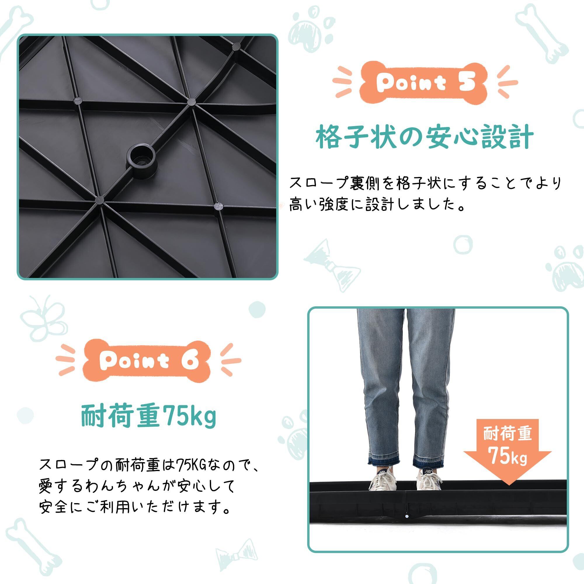【耐荷重75kg】スロープの耐荷重は75KGなので、チベタンマスティフ、ゴールデンレトリバー、アラスカなどの大型犬に適しています。愛するわんちゃんが安心して安全にご利用いただけます。【ご注意】ご購入前に使用高さを確認ください。多頭用ではありませんので、使用時は必ず1頭でご使用ください。スロープの表面は滑りにくい素材で、肉球にフィットするやさしいですので、昇り降りの際も痛くありません。