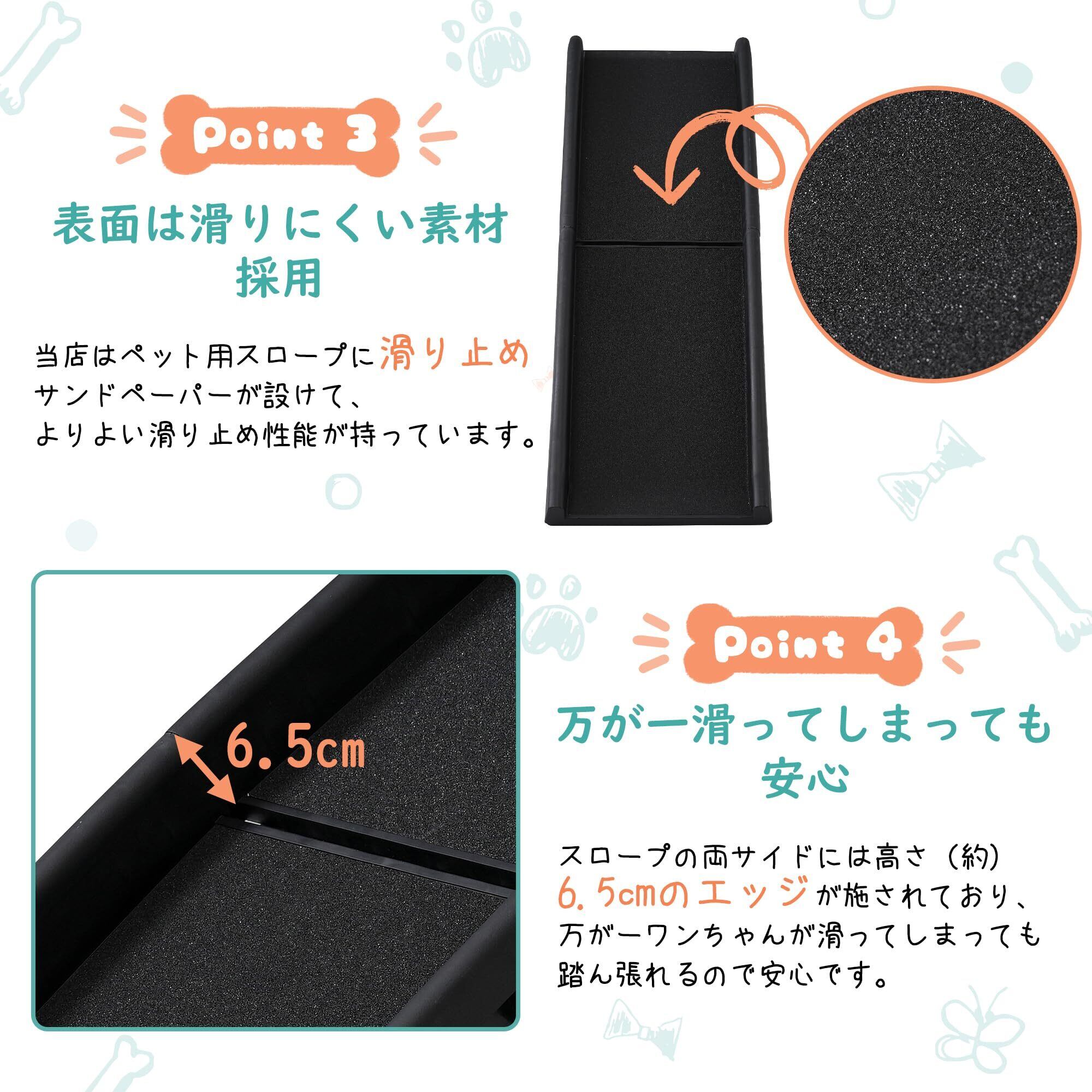 【優れた滑り止め性能】ペット用スロープに滑り止めサンドペーパーが設けて、よりよい滑り止め性能が持っています。安定感保有、滑らないように四つゴム足を設定しています。設置する際、本体裏側に滑り止めがあるので、しっかりと固定することができます。