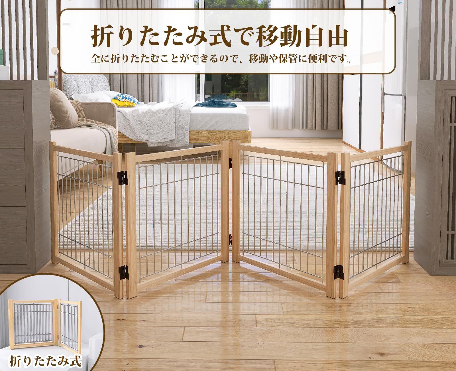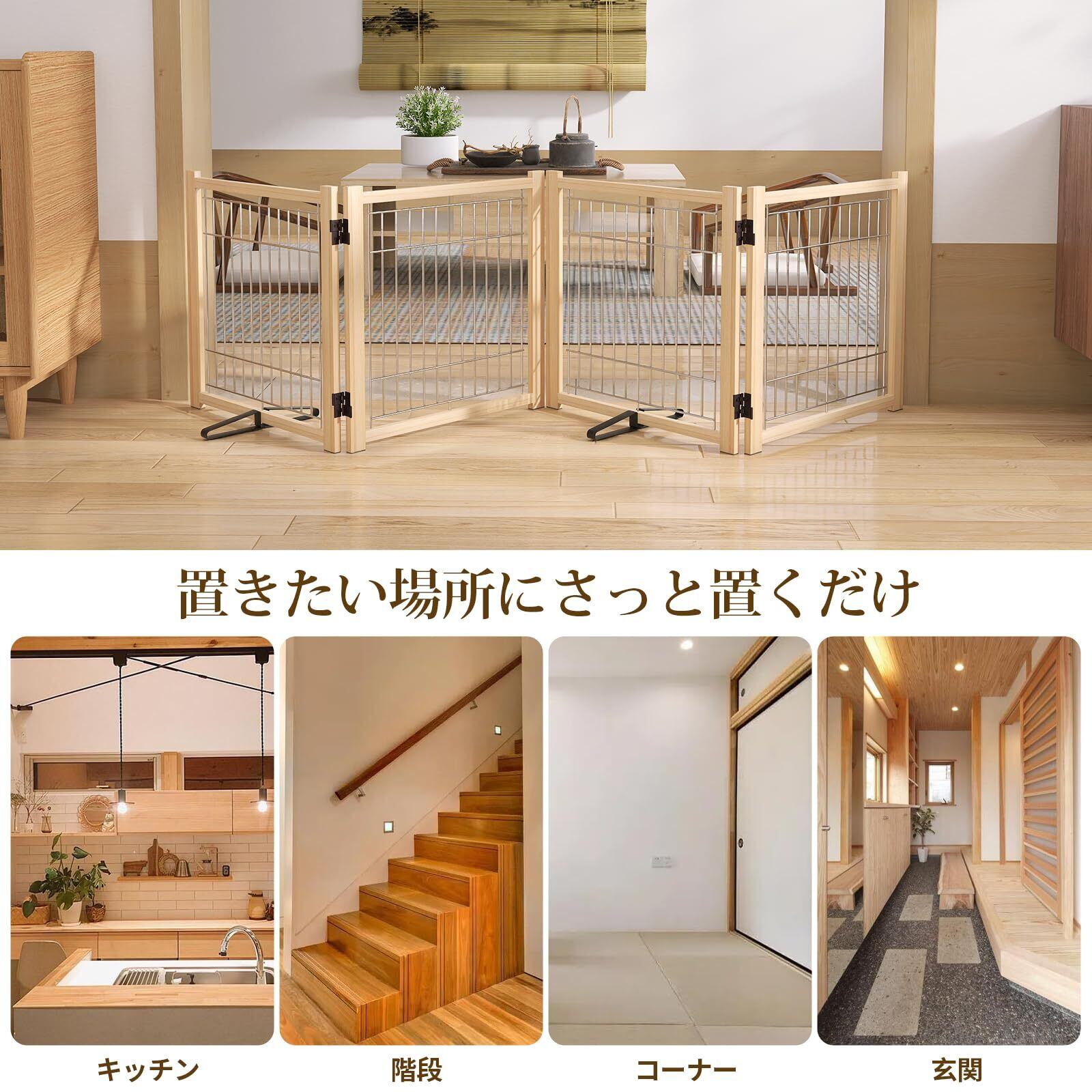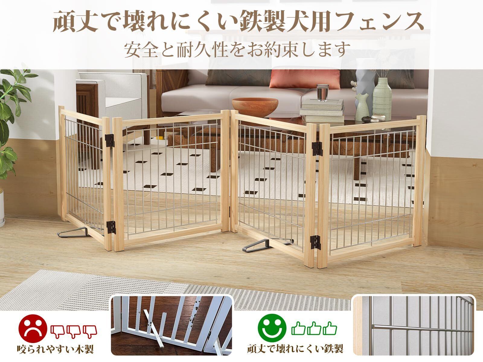 【ペットに優しい天然木】天然木で環境に優しいペットゲ-トです。柵の棒が鉄製で、デザインもシンプルなで、どんなお部屋にもマッチします。刺激的なにおいがなく、塗料なども使用していないので赤ちやんにとっても安全・安心です。ペットにもやさしい。