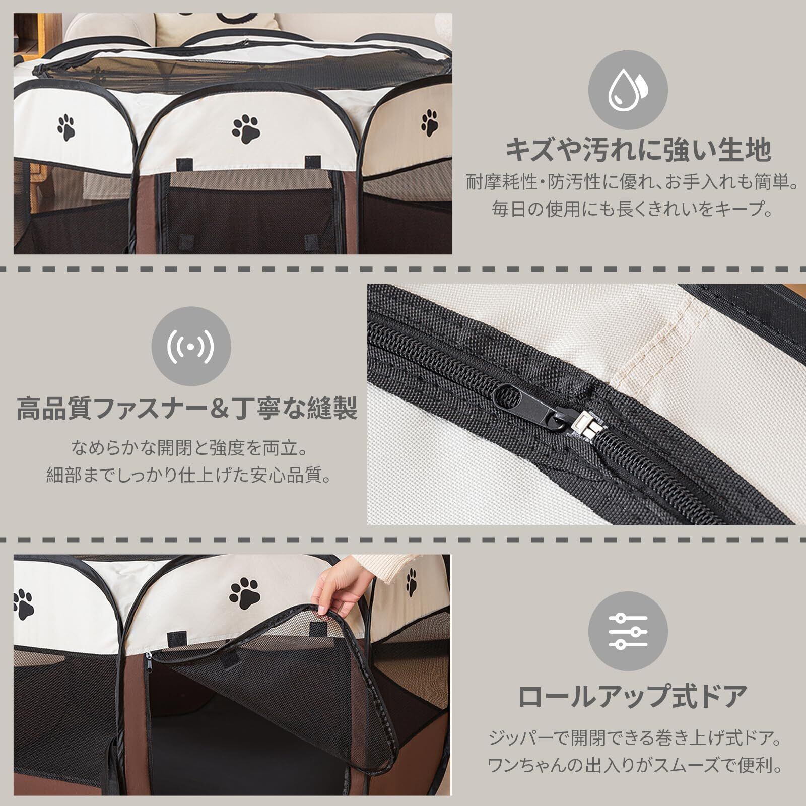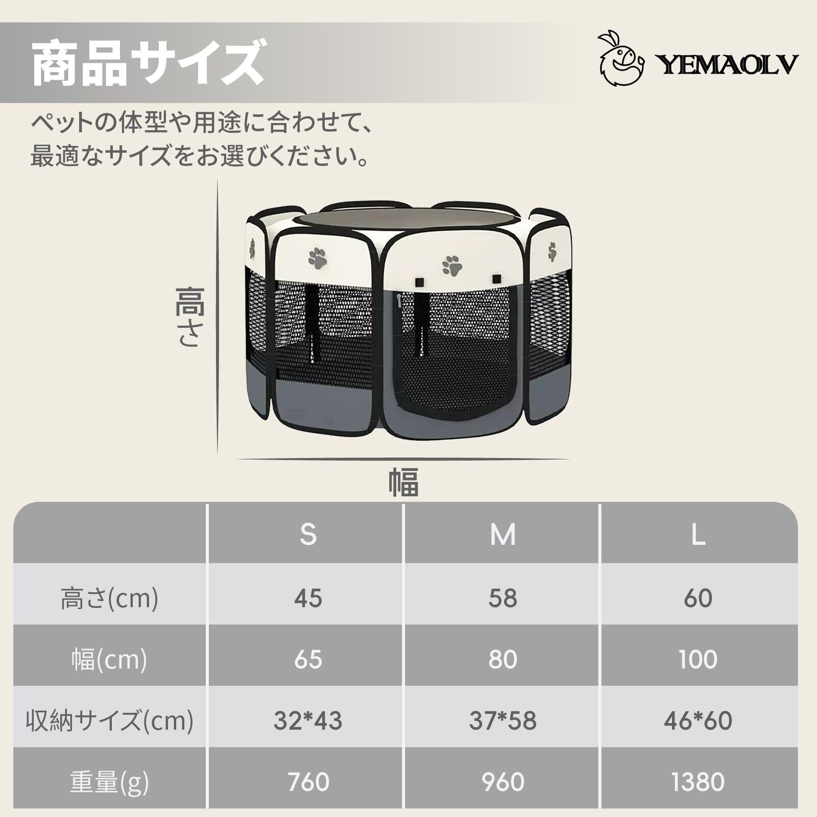 Sサイズは高さ約45cm、幅約65cmで、収納時は32×43cmほどのコンパクトサイズ。重さは約760gと軽量で、子猫や超小型犬にぴったりです。 Mサイズは高さ約58cm、幅約80cm。収納時は37×58cmとなり、重さは約960g。小型~中型のペットの遊び場やトイレ併用スペースとして最適です。 Lサイズは高さ約60cm、幅約100cmとゆったりサイズ。収納時は46×60cmで、重さは約1380g。中型犬や多頭飼いにも対応できる広さがあります。 ※採寸は手作業のため、1~6cmの誤差が生じる場合があります。 ※ペットの体型や用途(トイレ設置・休憩スペース・隔離用)に合わせてお選びください。