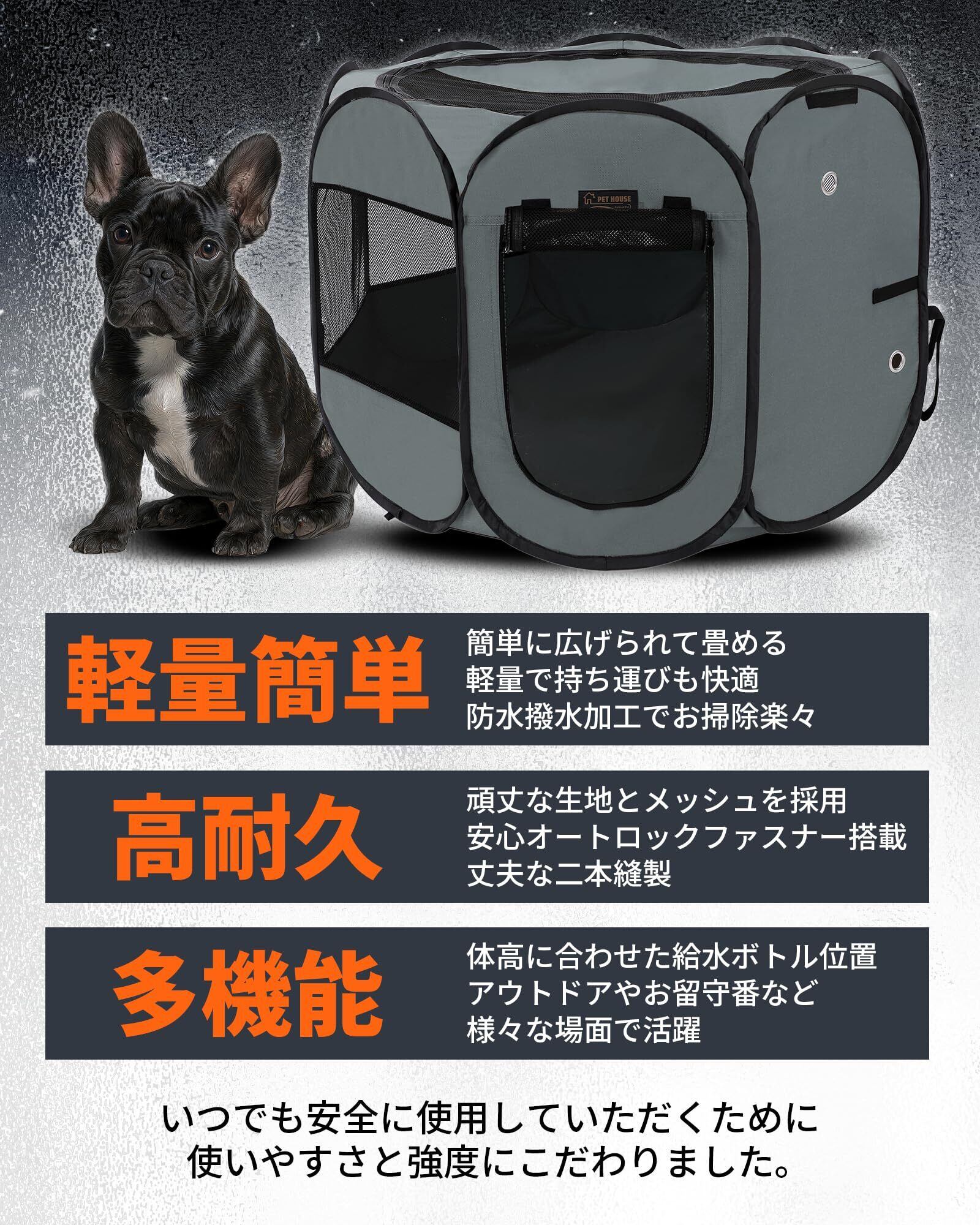 【高い品質を愛情価格で:軽くて簡単&高耐久】ソフトケージの常識を超える! 持ち運びやすさ × 壊れにくさを両立した新コンセプト・新設計 【優れた携帯性】 簡単に広げてたためる折りたたみ式。収納バック付きで持ち運びもラクラク。 【強化された耐久性】 床面・メッシュ生地の耐久性を強化。すべての縫製部分を二本縫いで仕上げ、破れにくさを向上。 【簡単お手入れ】 床面は防水・撥水加工済み。汚れが染み込みにくく、手入れが簡単でいつも清潔。 【安心の脱走防止】 ペットが内側から開けられない、安全なオートロックファスナーを採用。 【充実した機能性】 給水ボトルが設置可能で、お留守番時も安心。