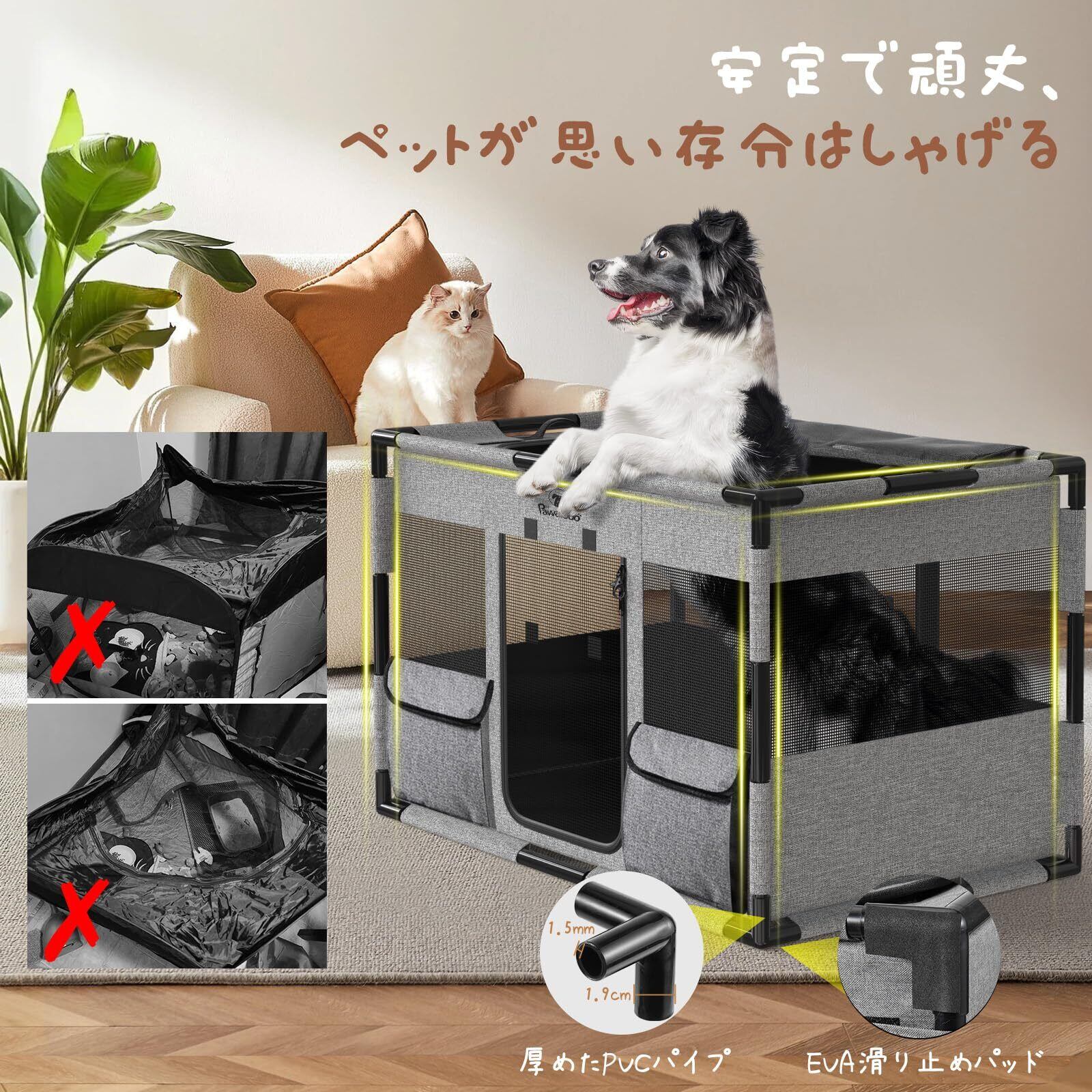 「お手入れ簡単」 上質なキャンバス生地を採用し、濡れ雑巾で拭くだけでもいいし、丸ごと水で洗い流しても大丈夫です。天面はファスナー式の覗き窓設計でオープンできますので、掃除のときは奥まで手が届けてさらに便利です。排泄物やよだれで汚れがちな底部は防水材質で、外に漏れることなく、汚れた部分だけをサッと拭き取って掃除できるのでお手入れ簡単です。ご注意:ペットにより快適な生活環境を作るために、サークルにペットシーツを置くことをお勧めいたします。