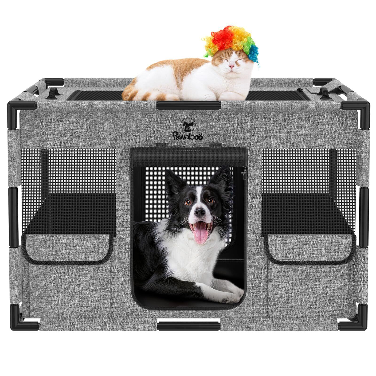 「ファスナー式扉設計」 製品全体はPVCパイプを利用してフレームを作り、前後にダブルファスナー式の扉を追加して、安定性にがあり、ペットの分娩室としても適用し、哺乳期の猫ママと子猫たちが自由に出入りできる優しいデザインです。ロック付きのファスナーを採用し、ペットが勝手に開いたりする心配は不要です。扉は巻き上げて固定できます。正面扉の両側に大きめのポケットが設計されており、収納袋、ペットのおやつ、又は他の小物収納にばっちりです。