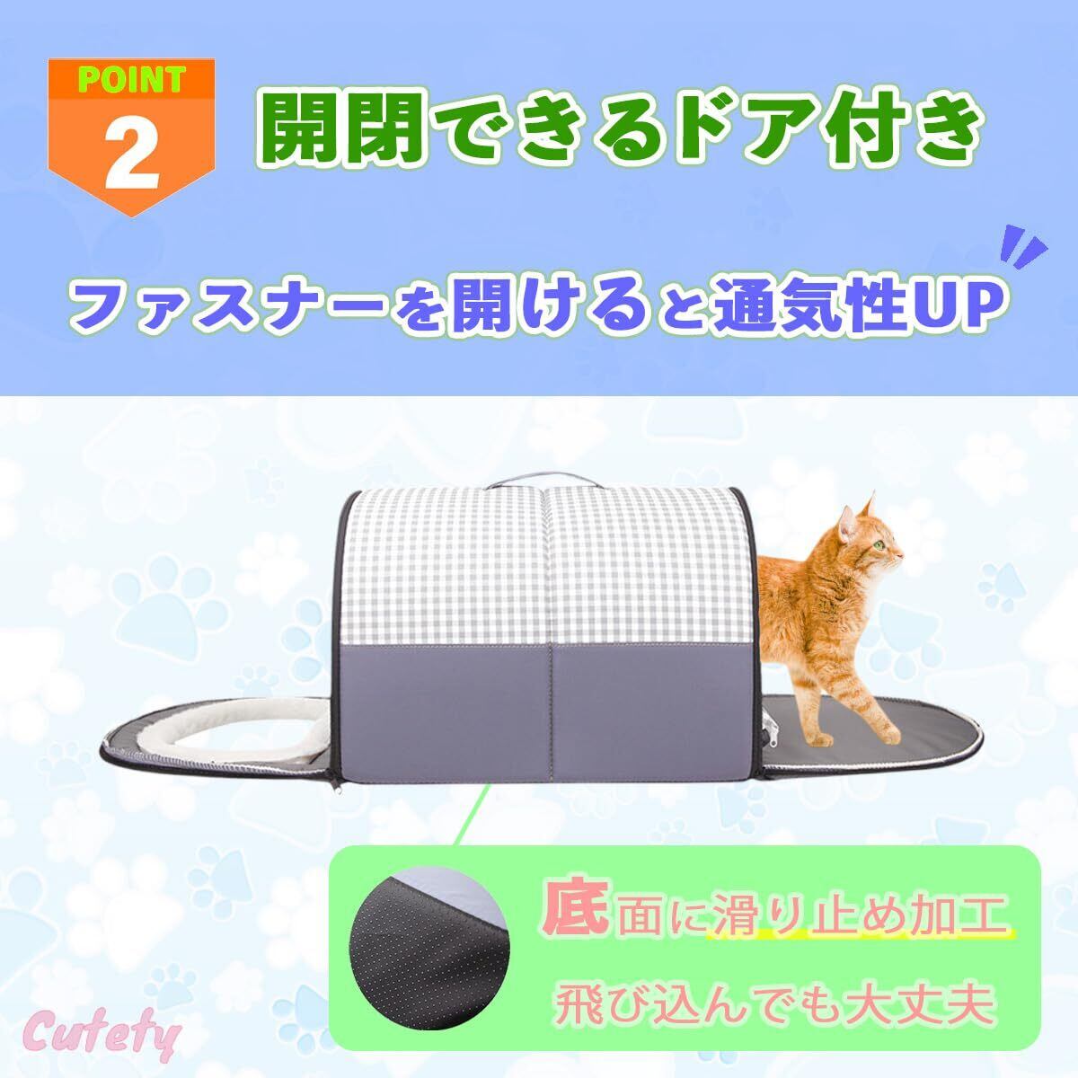 【便利な開閉ドア】前後のファスナーを開けるとトンネルになり、通気性UP!飛び込んだりする猫ちゃんのために底面には滑り止めを加工しました。