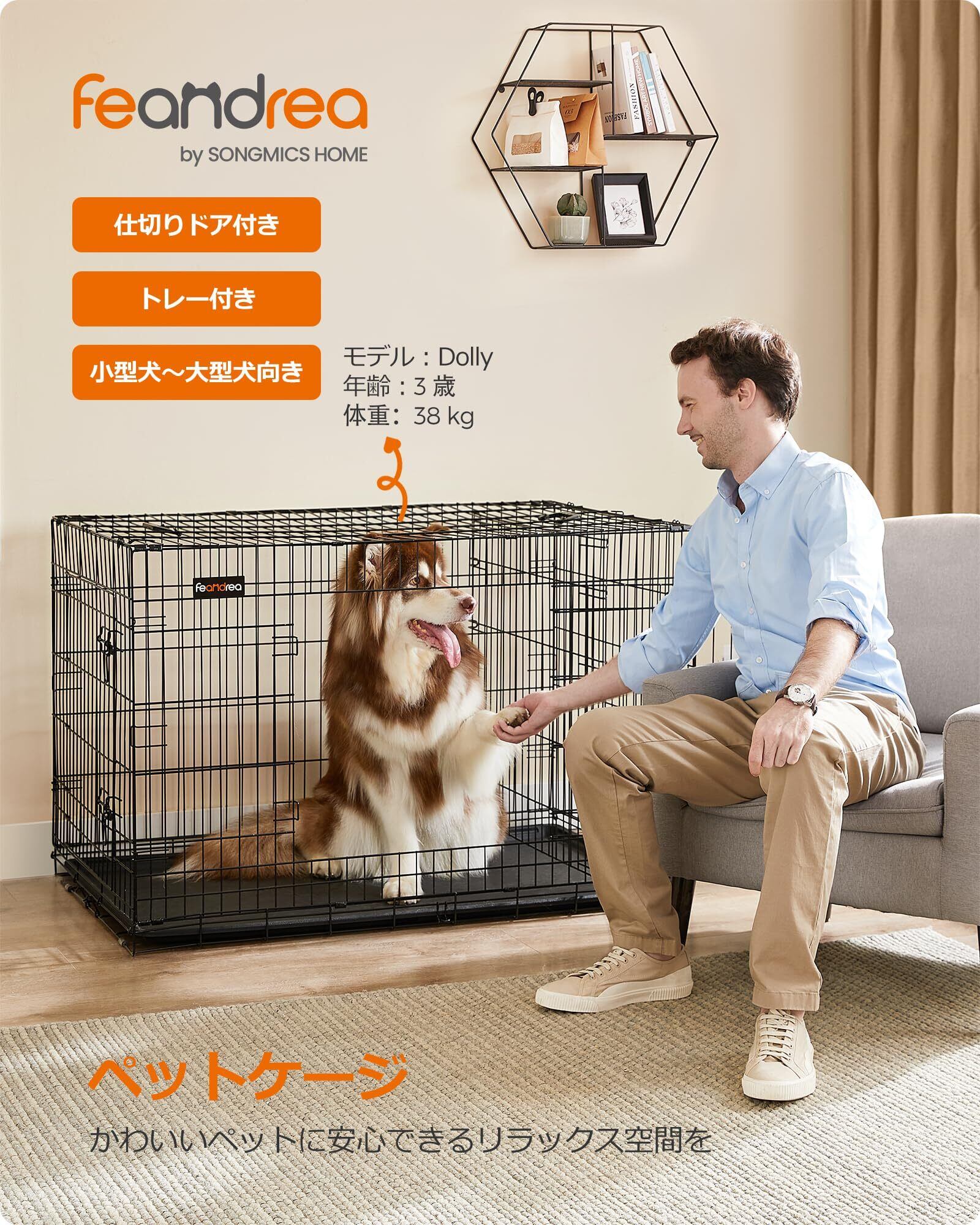 FEANDREA ペットケージ 犬 ケージ 中大型犬 仕切りドア付き 室内外兼用 122 x 74.5 x 80.5cm 引き出しトレー付き 折り畳み式 持ち手付き 移動便利 犬 ゲージ PPD48BK