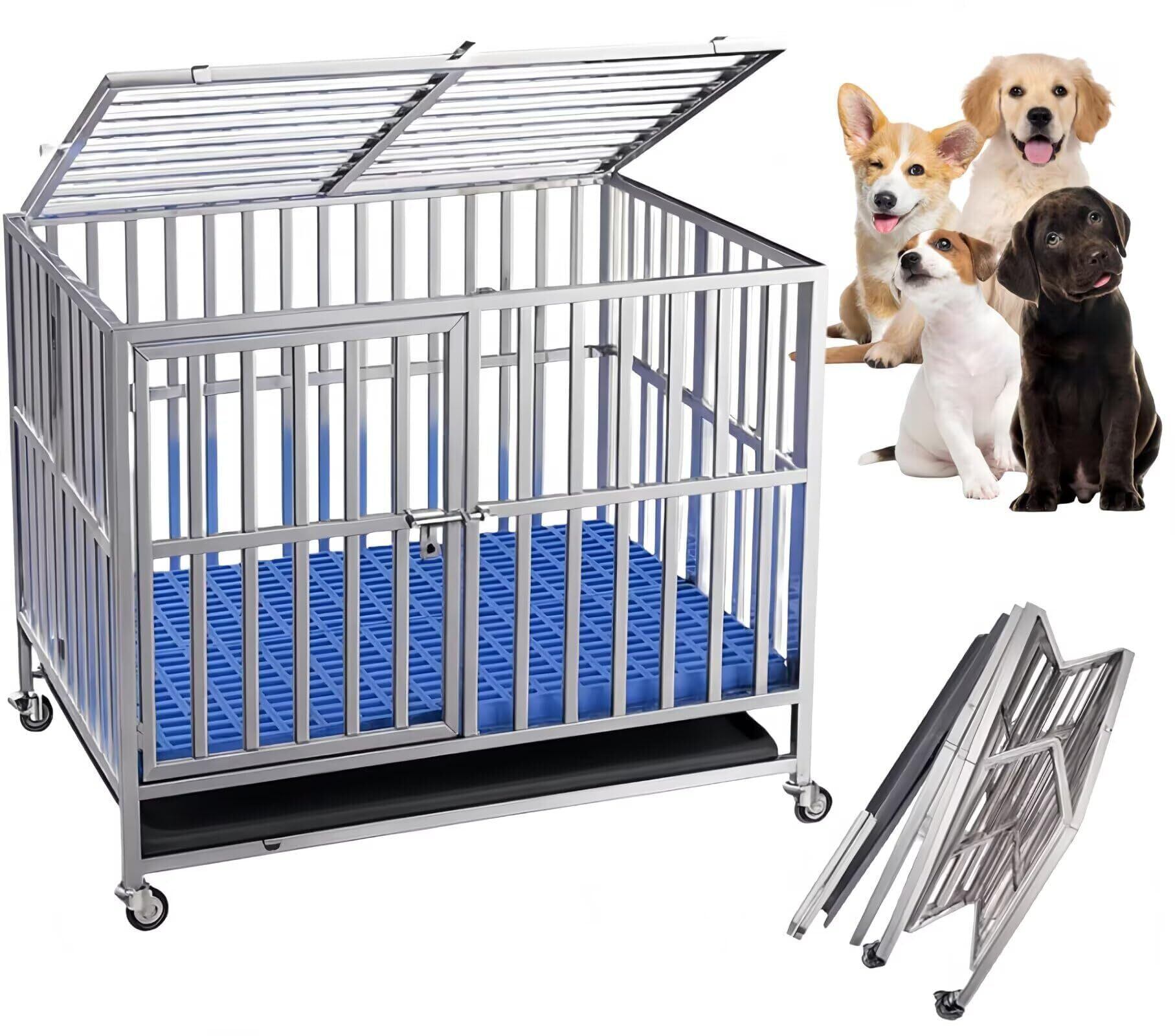 TUIYIDUO 大型犬 ゲージ ステンレス鋼製 長さ95×幅65×高さ79.3cm 犬 フェンス 折りたたみ可能 キャスター付き 引き出し式トレー 掃除簡単 マット/給餌器/屋根付き 適用小型/中型/大型犬 脱走防止 ペット用品 室内外兼用 日本語説明書付き