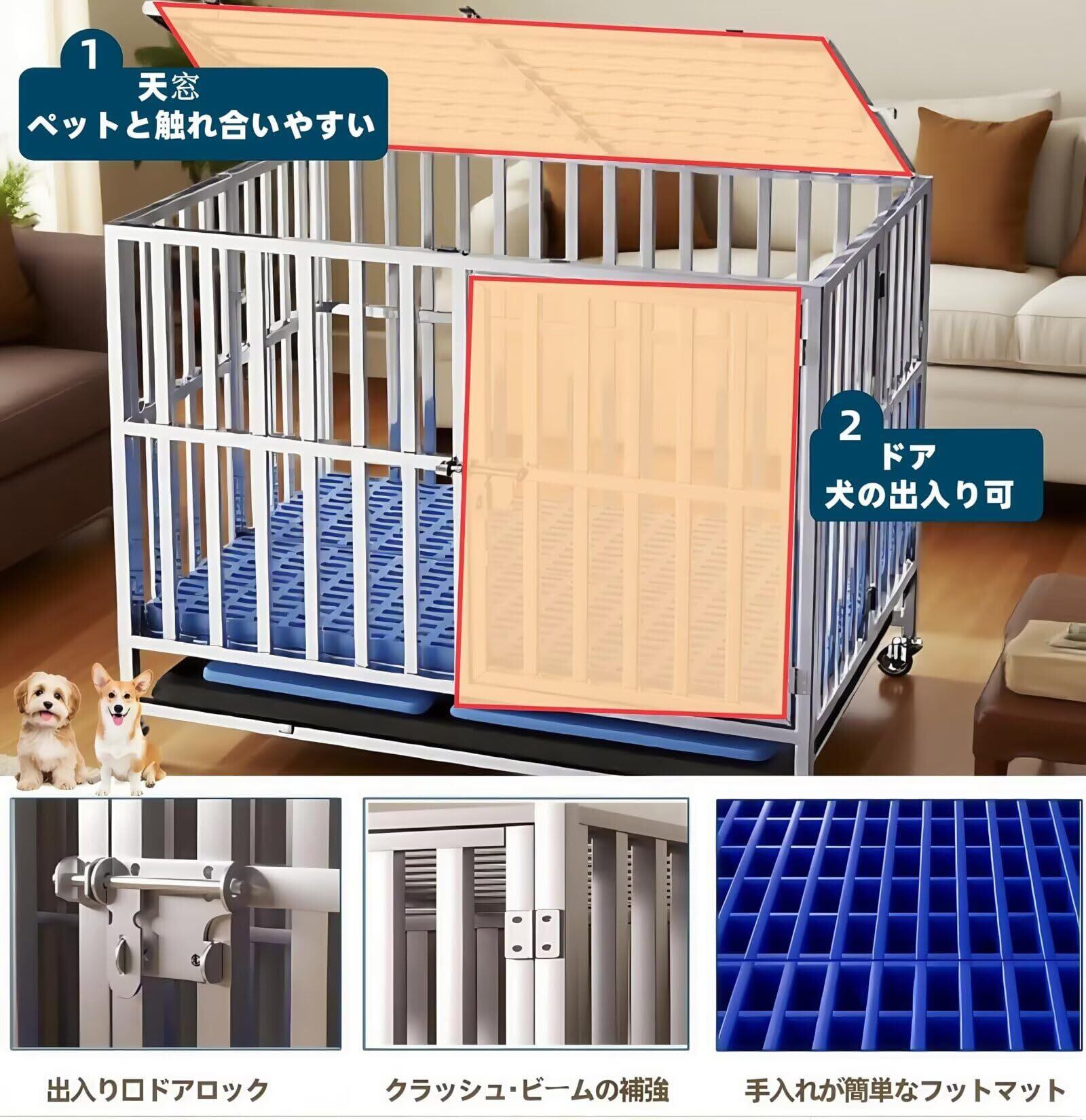 【思慮深いデザイン】ケージの上部は開閉可能で、パノラマ天窓を通して愛犬と触れ合うことができ、親密なコミュニケーションを楽しめます。子犬用のフットパッドが付属しており、赤ちゃんの前足が引っかかってケガをするのを防ぎます。また、愛犬がドアを開けて脱走し、事故を起こすのを防ぐセーフティロック付き。