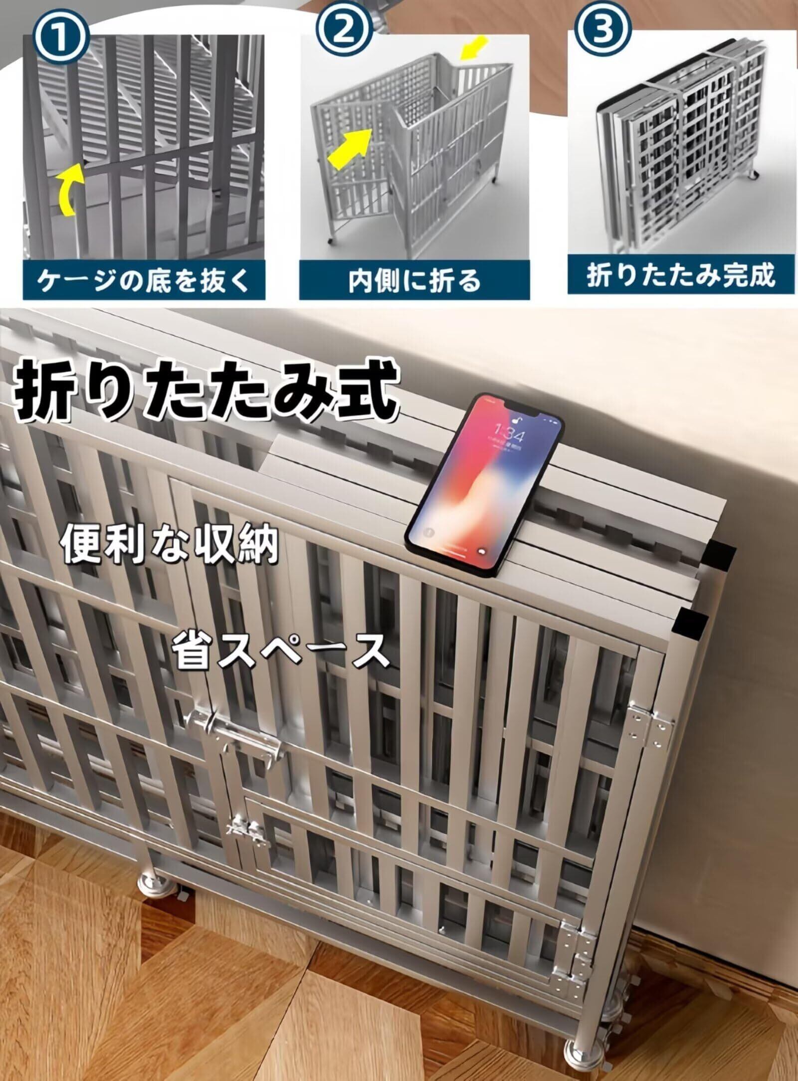 【折り畳み可能で犬用ケージ】この犬用ゲージは折り畳み式で、完全溶接されており、ネジを一切使用していないため、ネジの緩みによる不安がなく。使用しないときは、折りたたんで隅に置くことができ、場所を取りません、また、外出時には折りたたんで簡単に持ち運ぶことができる。
