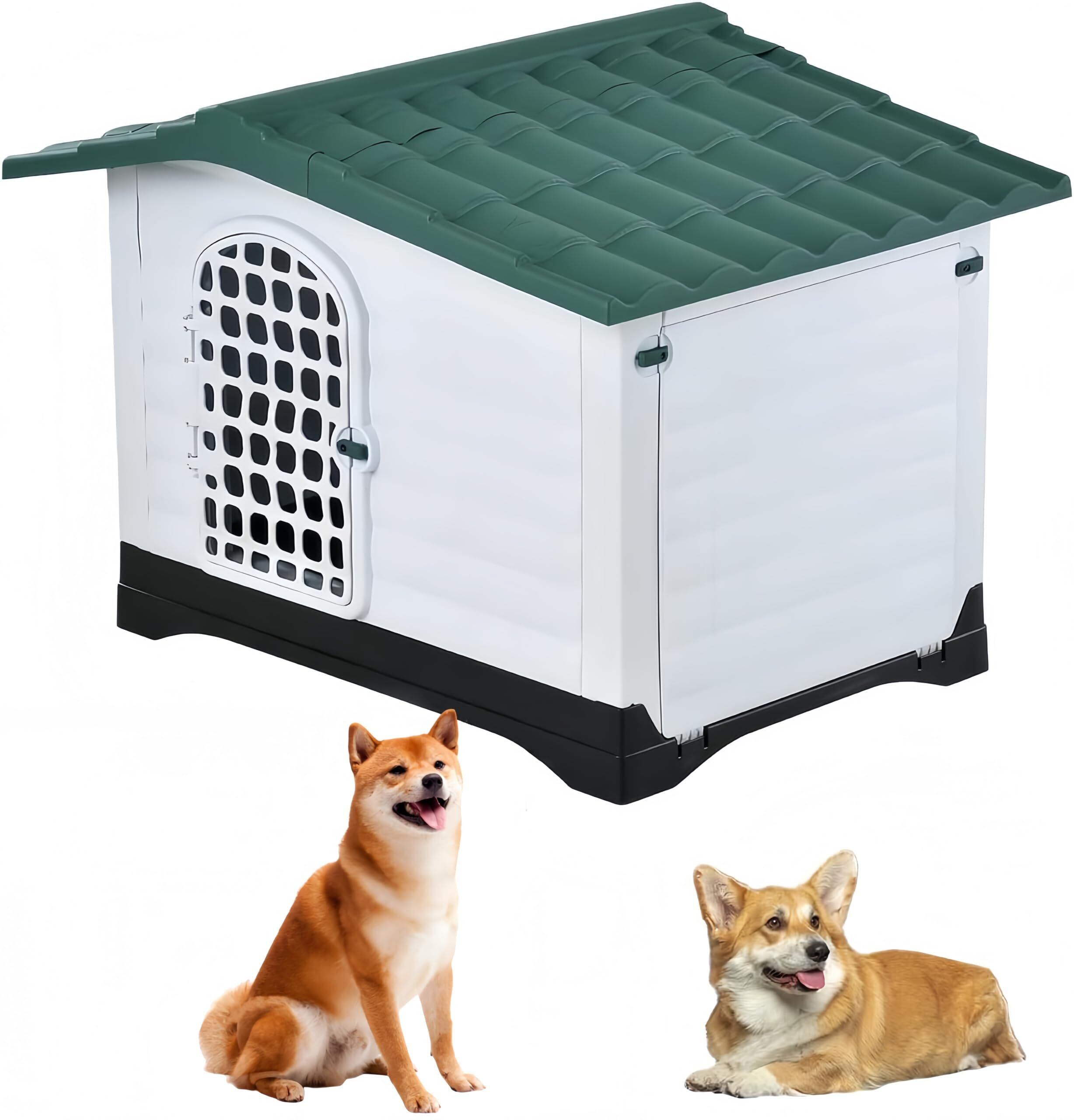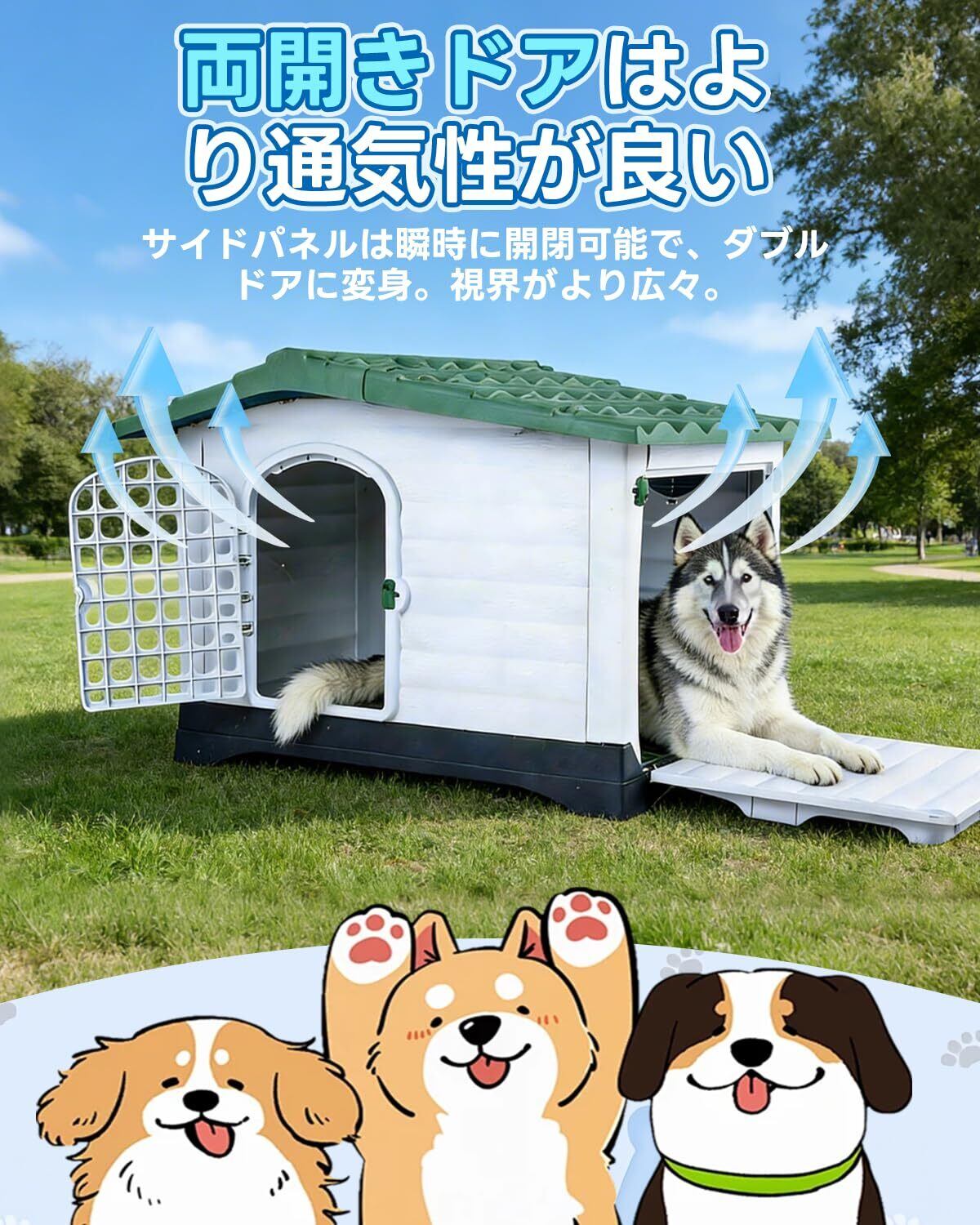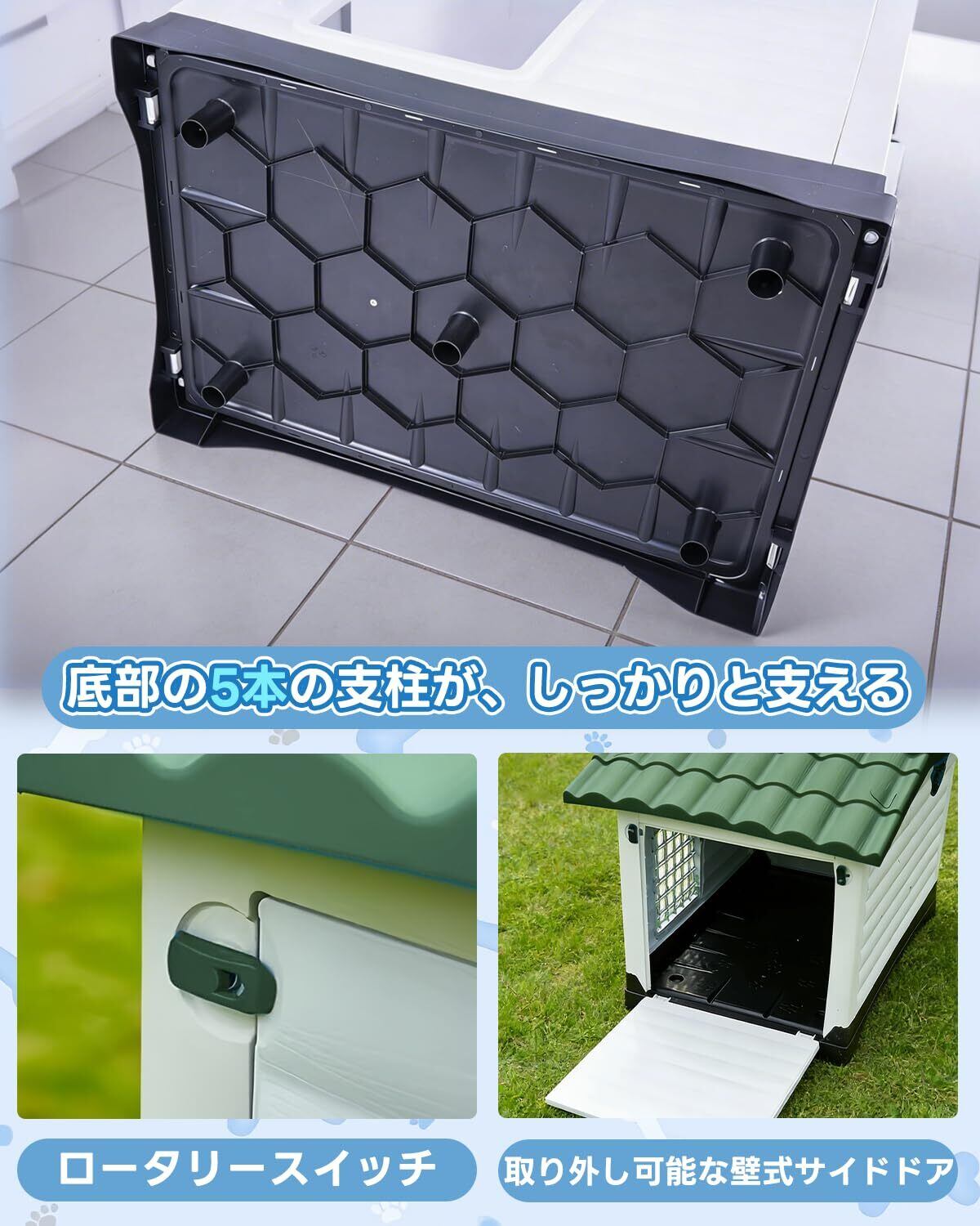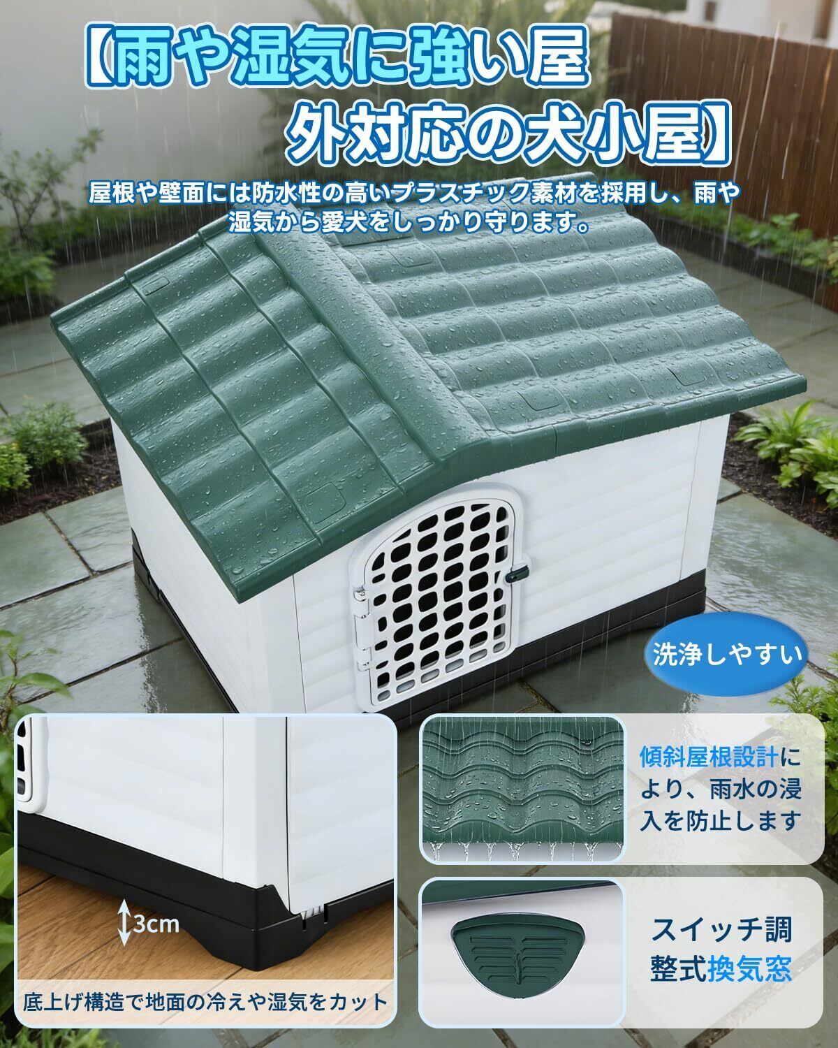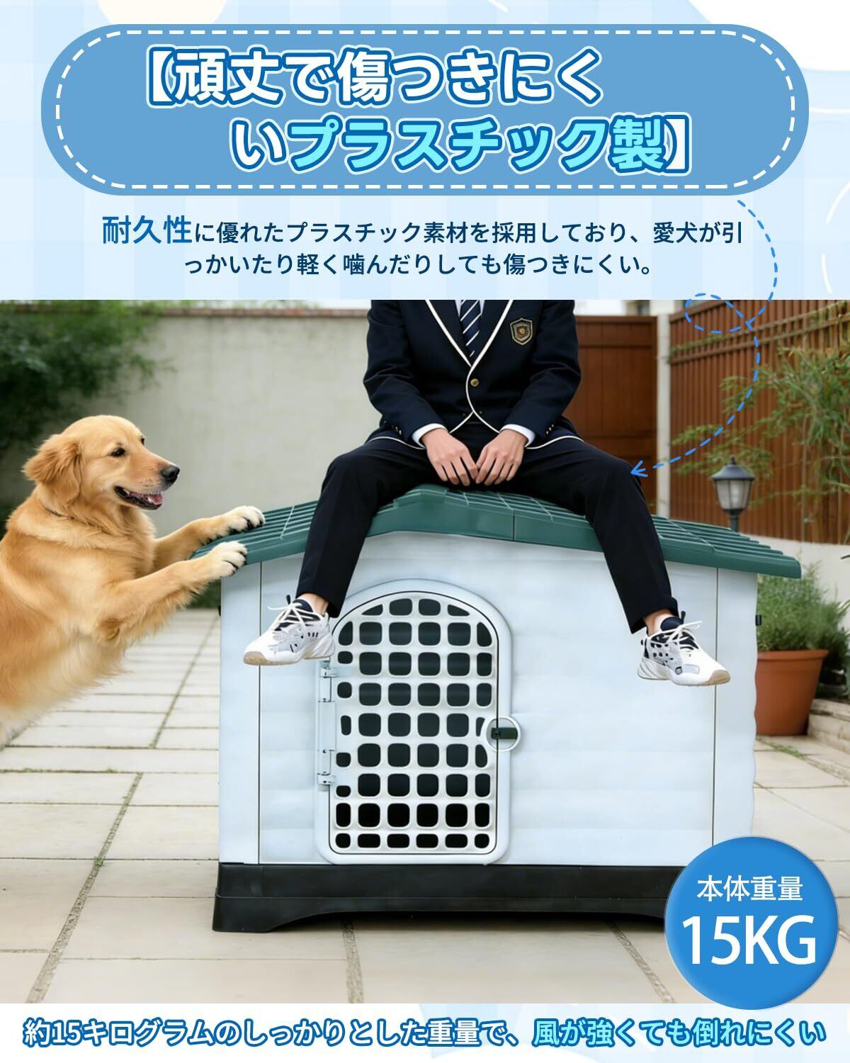 ️【頑丈で傷つきにくいプラスチック製】本体は耐久性に優れたプラスチック製で、愛犬が引っかいたり軽くかじったりしても傷がつきにくいです。約15kgのしっかりとした重さがあり、風の強い日でも倒れにくい安定感を確保します。屋外の犬小屋として長く使えるよう、構造の強度と安全性にこだわっています。