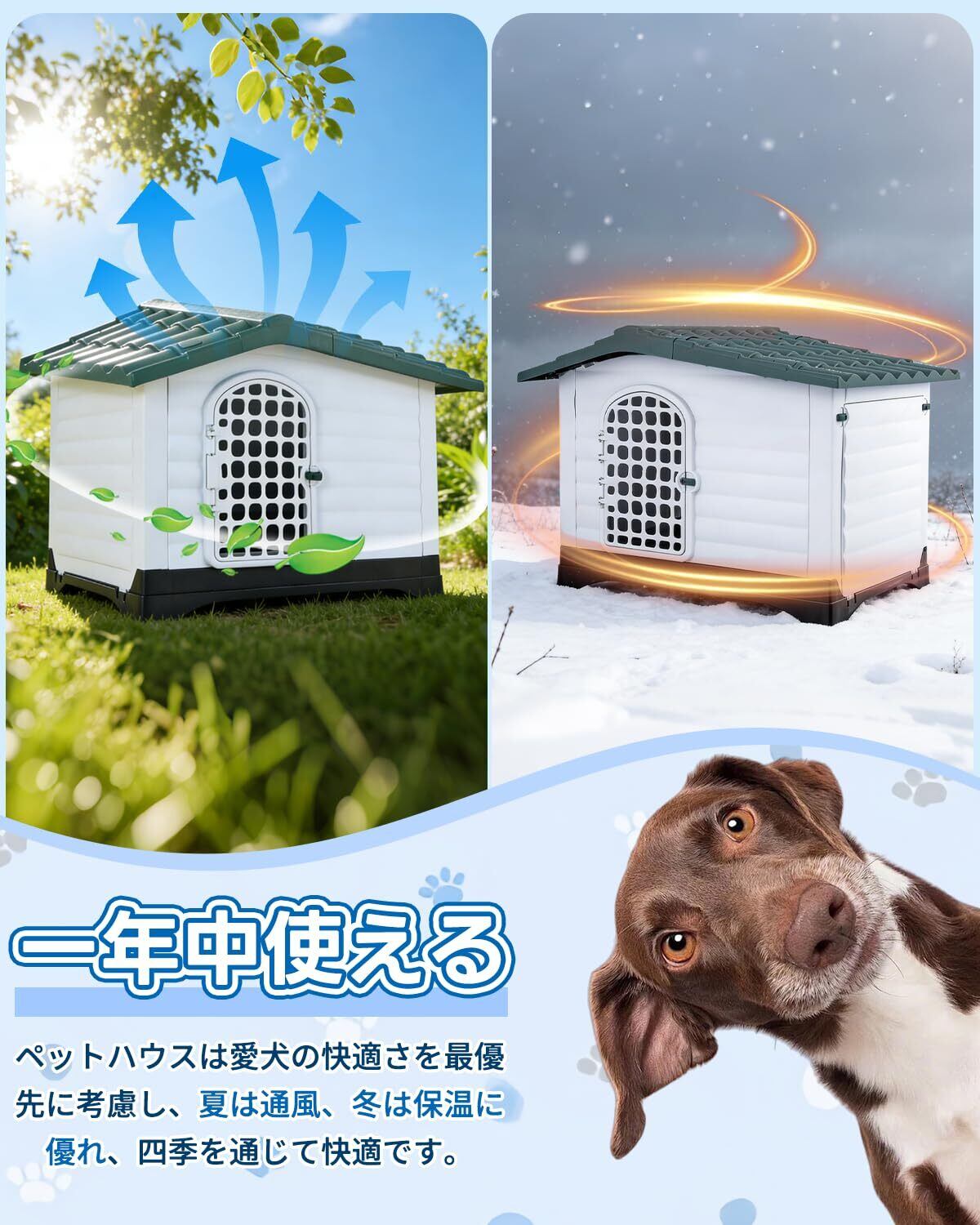 【通気性良くて、出入りしやすい】入口は中型犬が出入りしやすいように十分なスペースを確保し、頭や体をぶつけにくい形状に配慮しています。内部はこもりにくい構造で空気が循環しやすく、夏場の屋外使用でも蒸れにくいです。このペットハウスが愛犬の居心地を第一に考えて、春夏秋冬オールシーズンで使えます。
