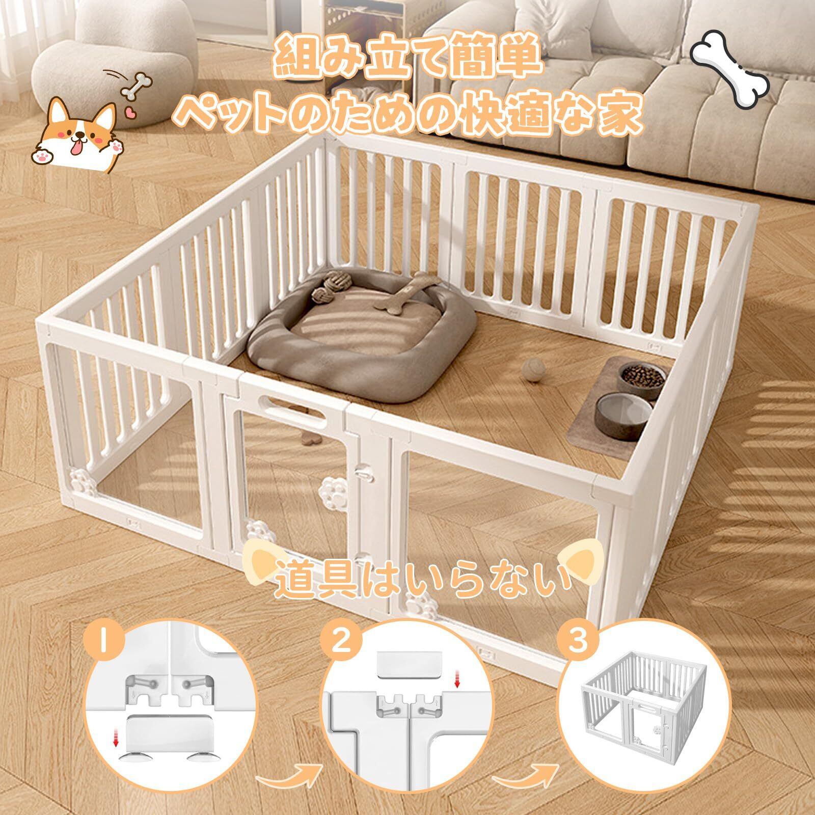【屋内外両用】このペットフェンスは屋内外問わず使用可能。庭での遊びやキャンプ、リビングルームでの運動や休息に最適です。日常的なトイレトレーニングやハウストレーニングにも便利で、ペットの健康と安全を守ります。