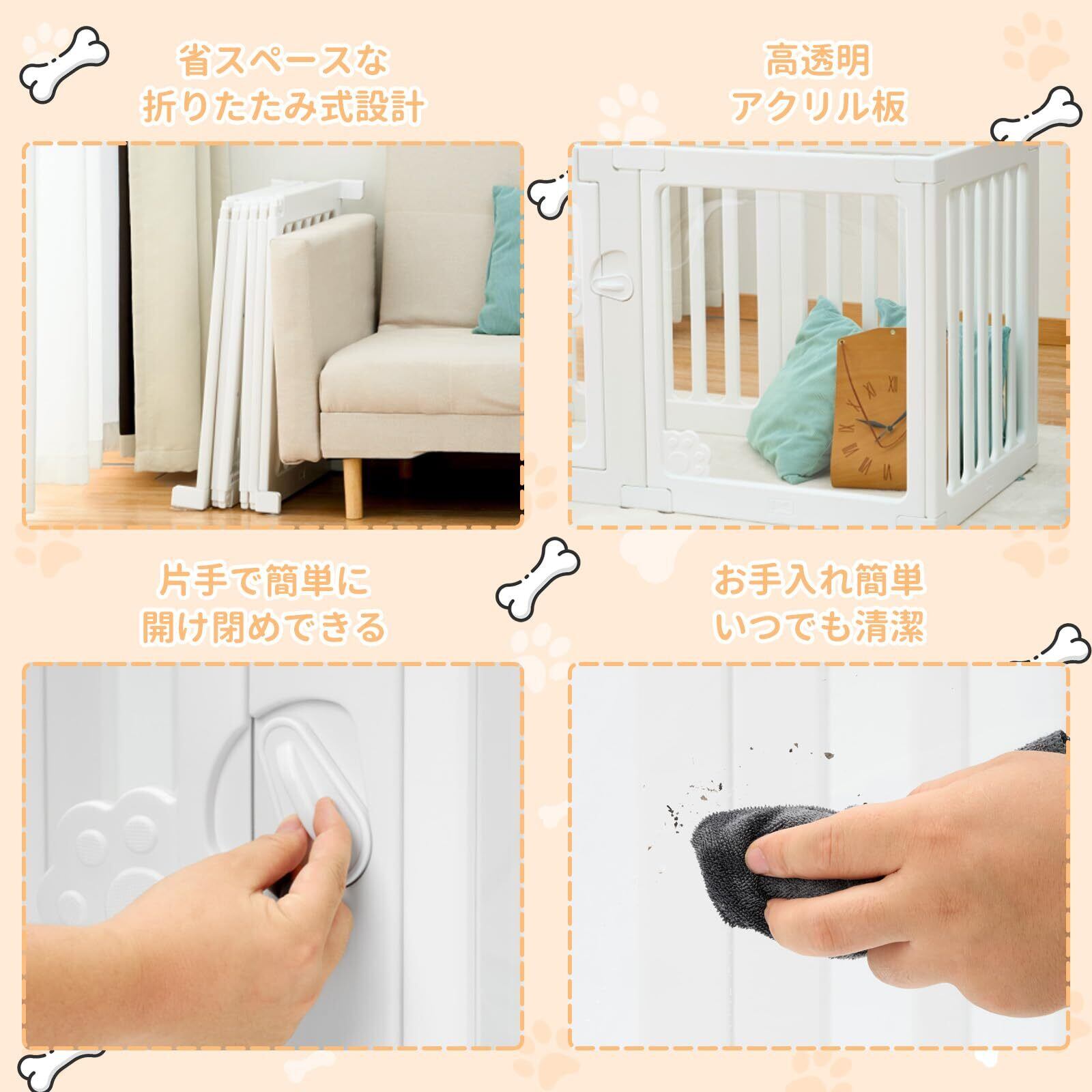 【クリアアクリルパネル&エコ素材】アクリル製の透明パネルと開閉しやすいドアが特徴。ドアは片手で簡単に開閉でき、使い勝手も抜群です。アクリル部分には可愛らしい猫爪デザインが施され、見た目にもかわいらしさをプラス。白を基調としたシンプルで高級感のあるデザインで、お部屋に自然に溶け込みます。環境に優しく、無毒無臭の安全な素材を使用しており、大切なペットの健康を守ります。