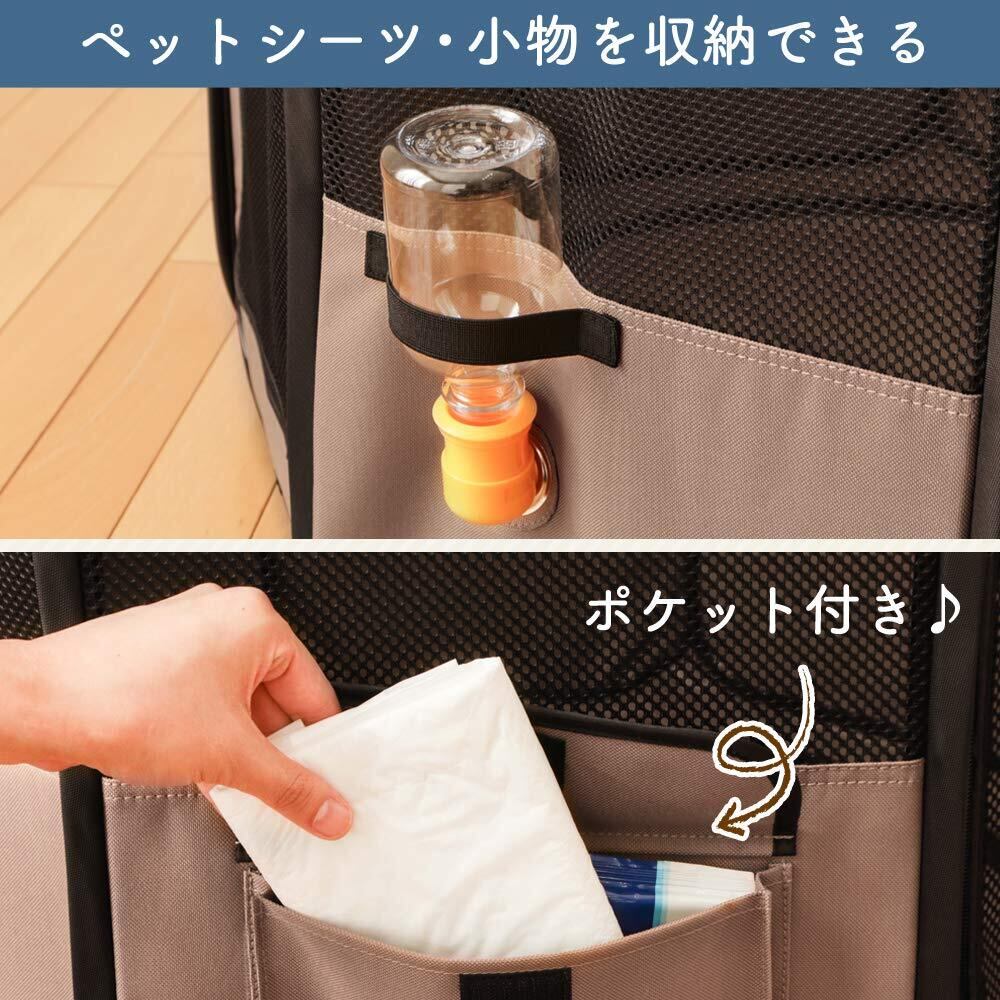 【商品説明】:組み立てが簡単で、コンパクトに折りたためるソフトケージです。外出先や、急な来客、災害時の緊急対策にも便利です。持ち運びに便利なキャリングバッグ付きです。愛犬の様子がよくわかる上半分メッシュ加工です。通気性も抜群です。汚れをふき取りやすい内側PVC加工です。ロールアップして脱着テープで留められる側面扉、飛び出し防止のメッシュの天面付きです。別売りの給水ボトルが取り付け可能です。