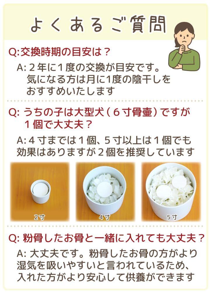 骨壷の中に直接お入れください。湿気は下に溜まるため、一番底に入れるのがおすすめです。 すでにお骨が入っている場合には一番上にポンと載せるだけでも大丈夫です。 1つでも効果はありますが、5寸以上はお2つ入れて頂くのがおすすめです。 ※粉骨(パウダー化)したお骨にもお使いいただけます。