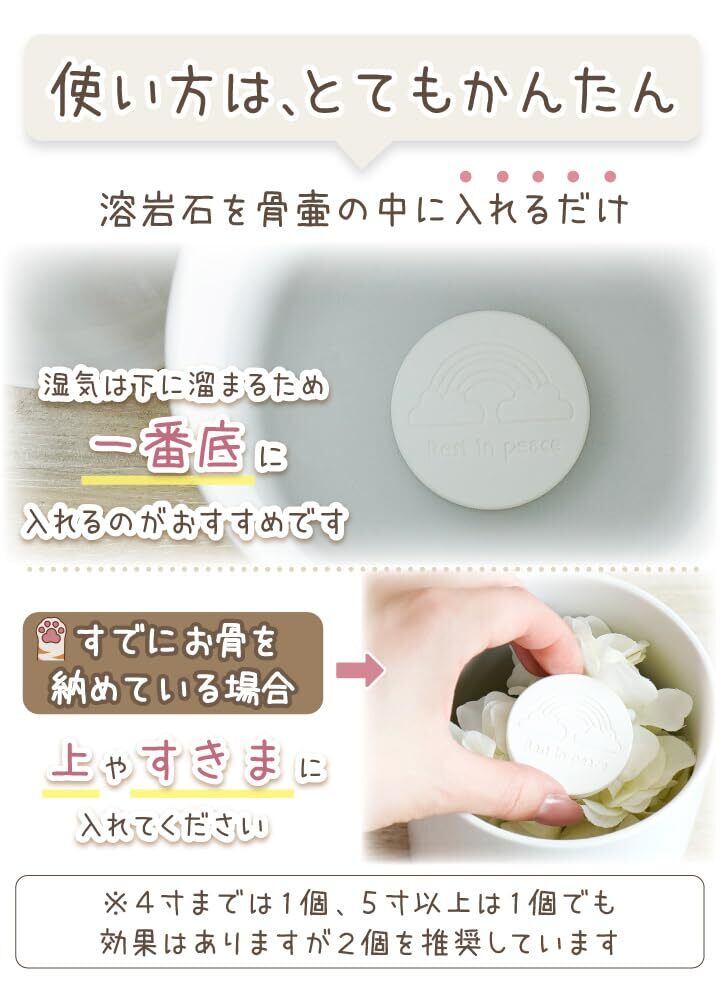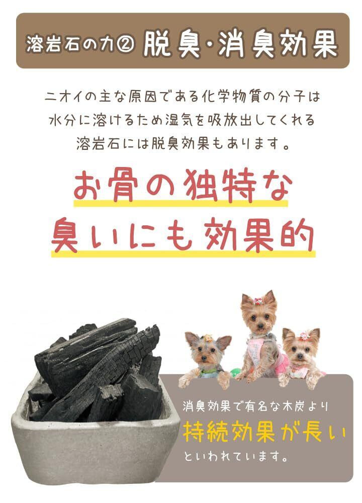 大事なペットちゃんの遺骨を守るために、骨壷に入れてお使いいただけるミニサイズの溶岩石です。 湿気を吸収してカビ菌が繁殖しずらい状態を保ってくれるほか、脱臭効果にも優れています。