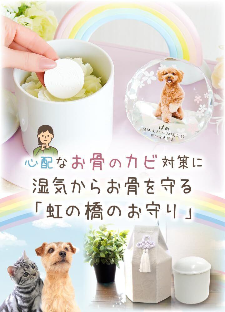 「虹の橋」は、亡くなったペットたちが幸せに暮らすと言われる場所。 私たちがいつか再会するまで、安らかに過ごしてほしいという気持ちを形にしました。 かわいい小さなお守りが、「いつまでも大好き」という想いに寄り添います。