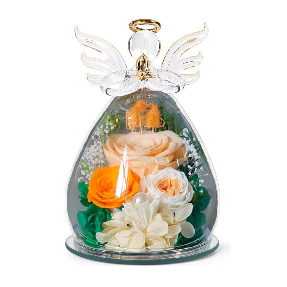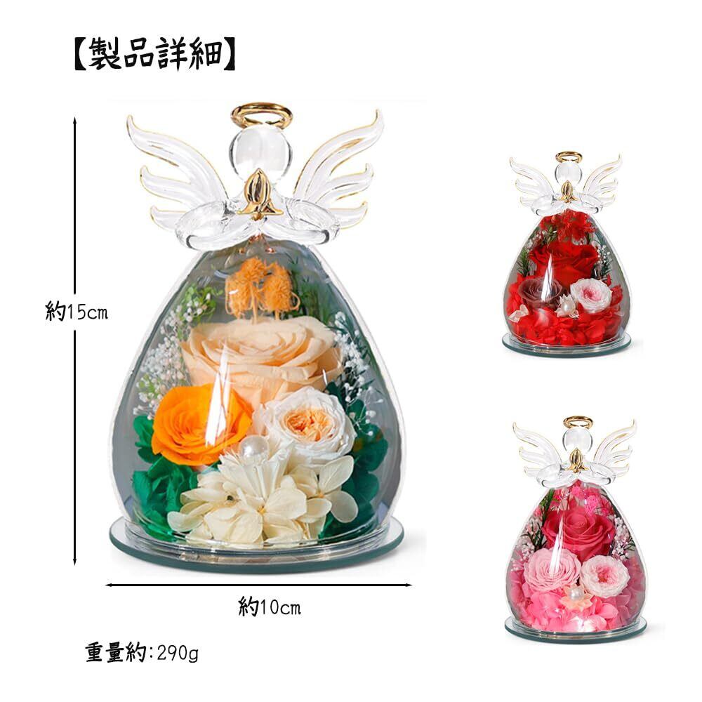 【天使の透明ガラスケース】可愛らしいガラスの天使が両手を合わせて祈っています。花はガラスの蓋(ふた)の中にあるので、ほこりがつく心配はありません。どの角度から見ても美しい花を眺めることができます。