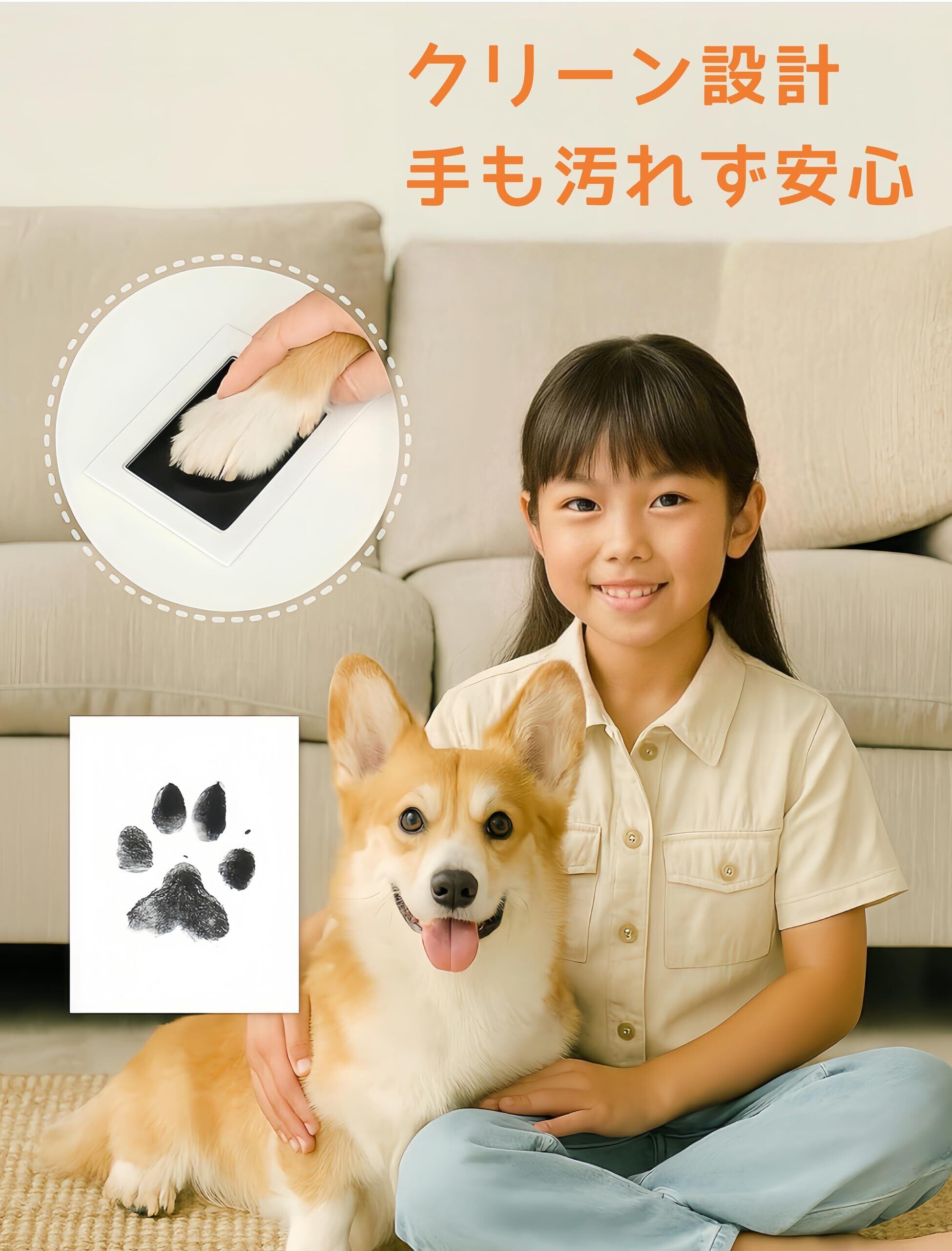 【手足が汚れない安心設計】 ペットの足をインクに直接つける必要なし。フィルム面を上にして足を軽く押すだけで、清潔に、愛猫・愛犬の足型を残せます。