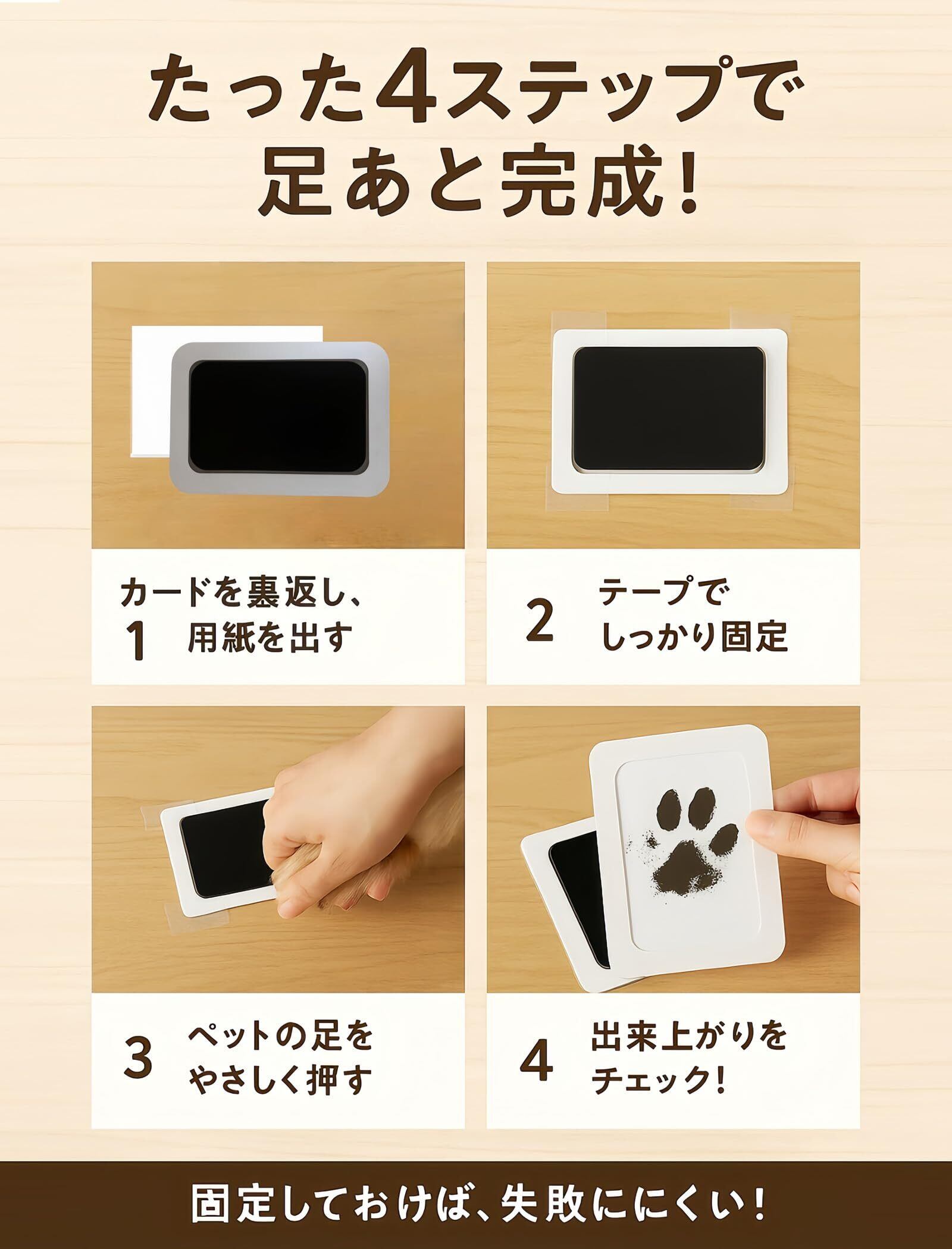 【簡単操作&繰り返し使用可能】 操作はシンプルですが、押し方によって仕上がりに差が出るため、説明書を参考に丁寧にトライするのがおすすめ。 綺麗に押すコツもたっぷり: ・パッドをテープで固定する ・リラックスタイム中に試す(例:昼寝中) ・保湿クリームを軽く塗る ・肉球間の毛を少しカットするとさらにくっきり ・2人での操作がスムーズ!