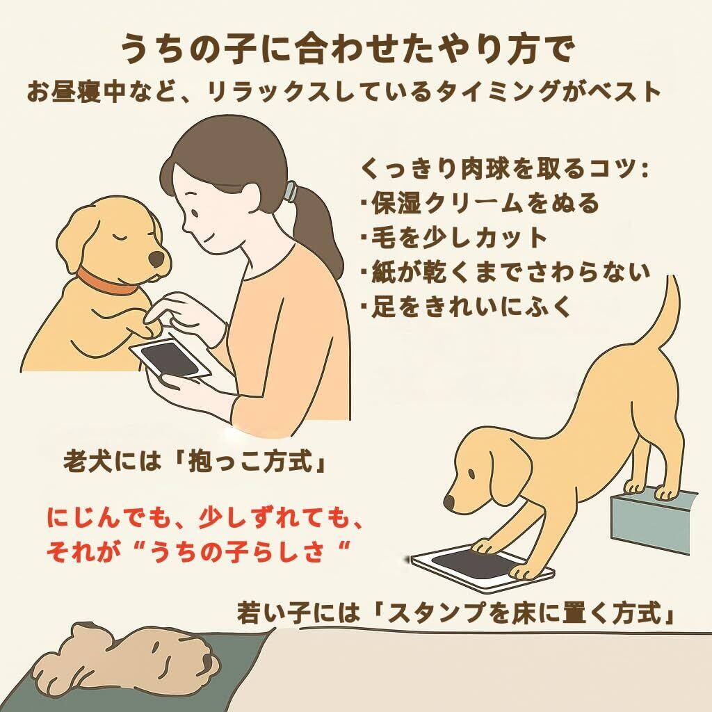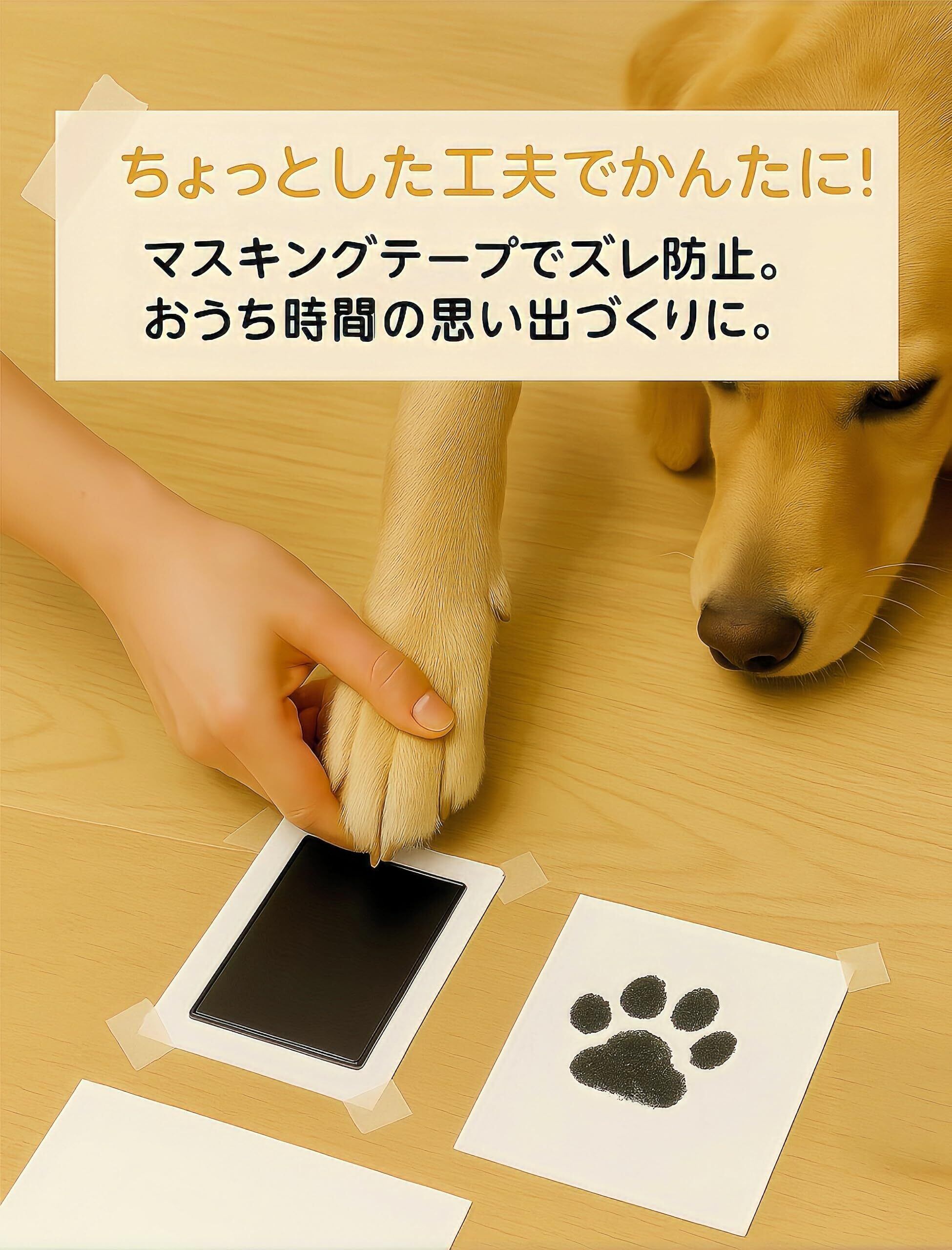 【1人でもできる工夫も紹介】 ひとりで挑戦される場合は、インクと紙を床や壁にテープで固定しておくとスムーズです。ペットの個性に合わせた工夫で成功率が上がります。