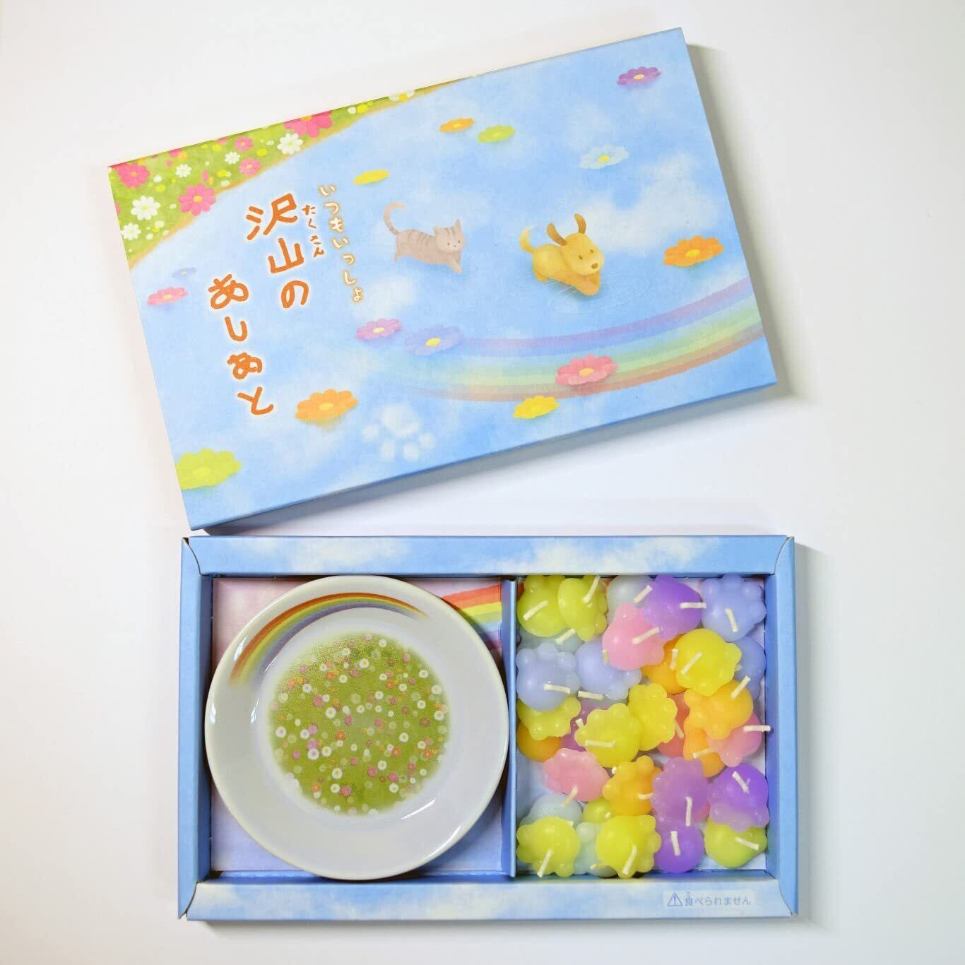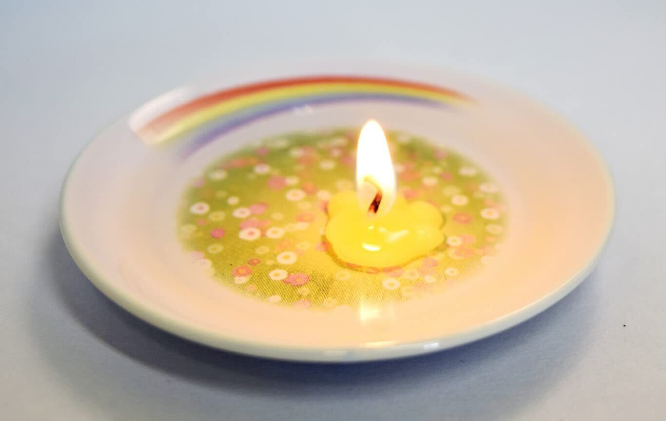 人気のペット供養シリーズにかわいい肉球ろうそくが新登場です! ■ペットは亡くなると天国の手前にある虹の橋で愛し合った人を待つと言われています。その待ち合わせ場所である虹のふもとをろうそくで表現しました。ペットロスで落ち込んでいる方へのお悔やみとして贈ると気持ちが伝わります。 ■ご使用方法 1.虹の橋のたもとのお皿に水を薄く注ぐ 2.あしあとろうそくを浮かべる 3.火を灯し、虹の橋で待っているあの子に想いを寄せてください。