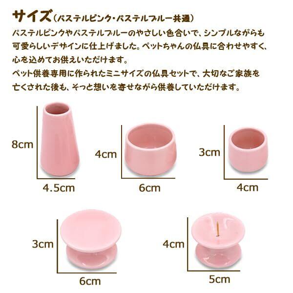 「やさしいパステルカラーの2色展開」 パステルピンクとパステルブルーの陶器製仏具。お部屋に自然に馴染む落ち着いた色合いで、愛しい子を穏やかに偲ぶ空間をつくります。