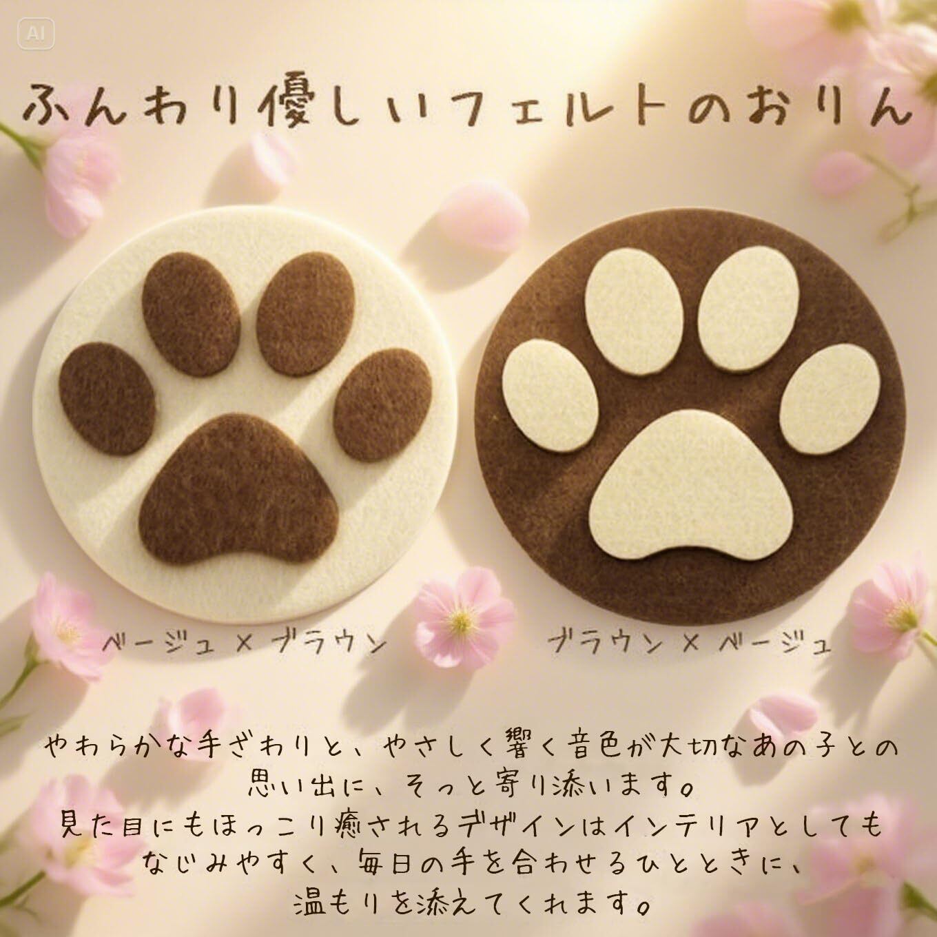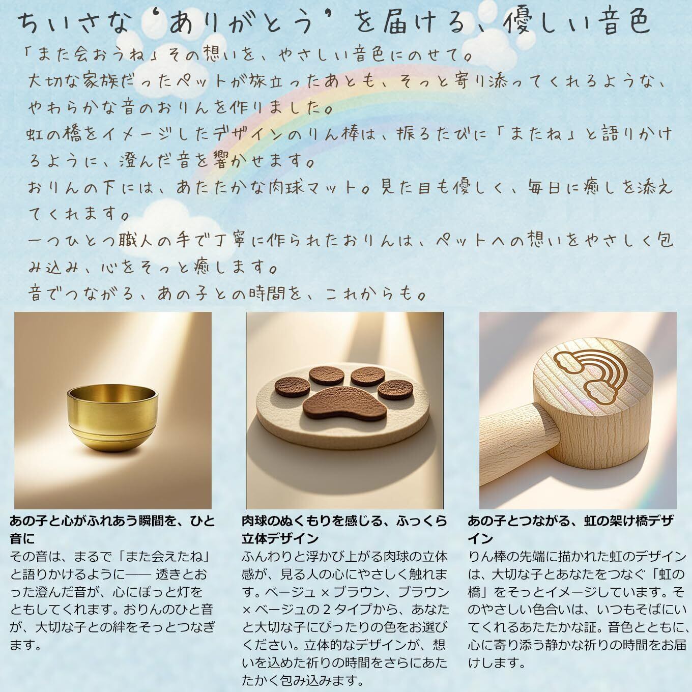「肉球デザインのフェルトマットおりん付き」 響きのよい音色のおりんは、かわいい肉球のフェルトマット付き。りん棒には「虹の橋」をモチーフにしたロゴが入っています。