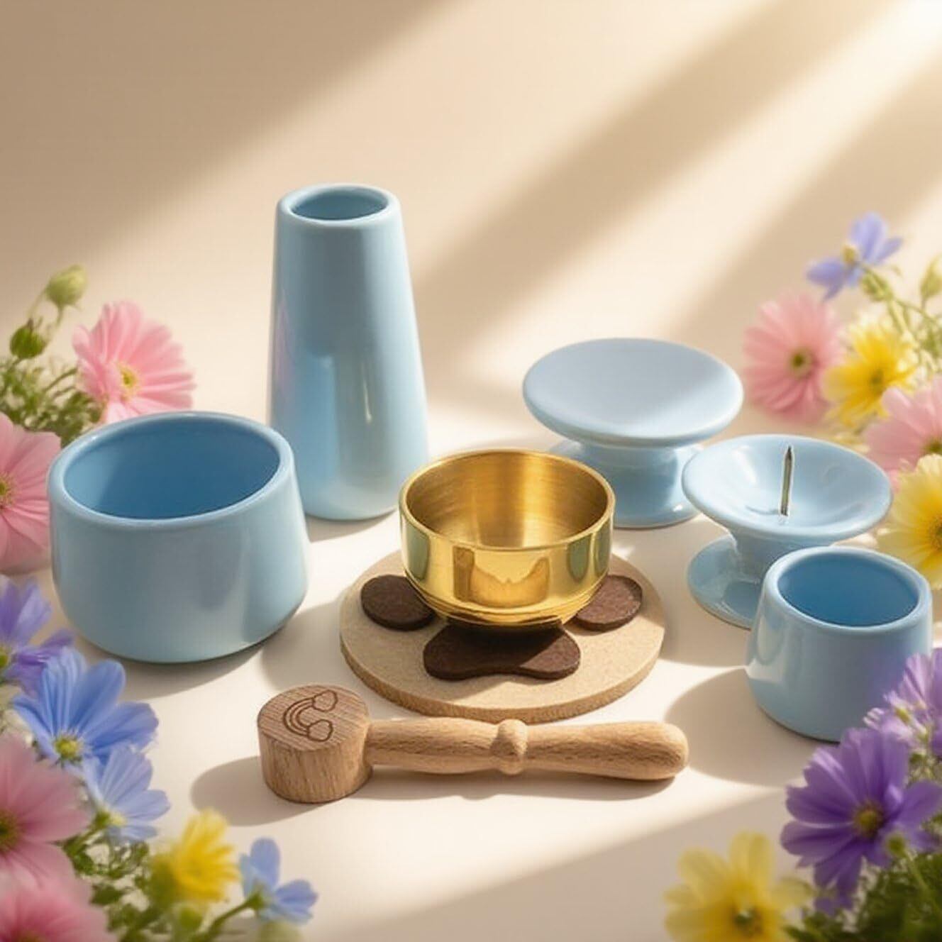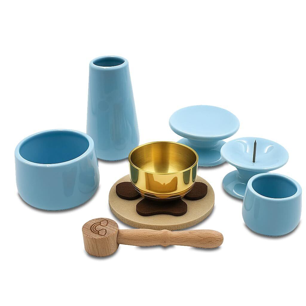 【ペット仏具セット 8点 パステルブルー】かわいいパステルカラー 肉球フェルトおりん付き 虹の橋りん棒 カラフルろうそく付属|かわいいミニサイズ 仏具 花立・香炉・水入れ・供物皿・ろうそく立て・香炉灰セット(ペット供養専用)