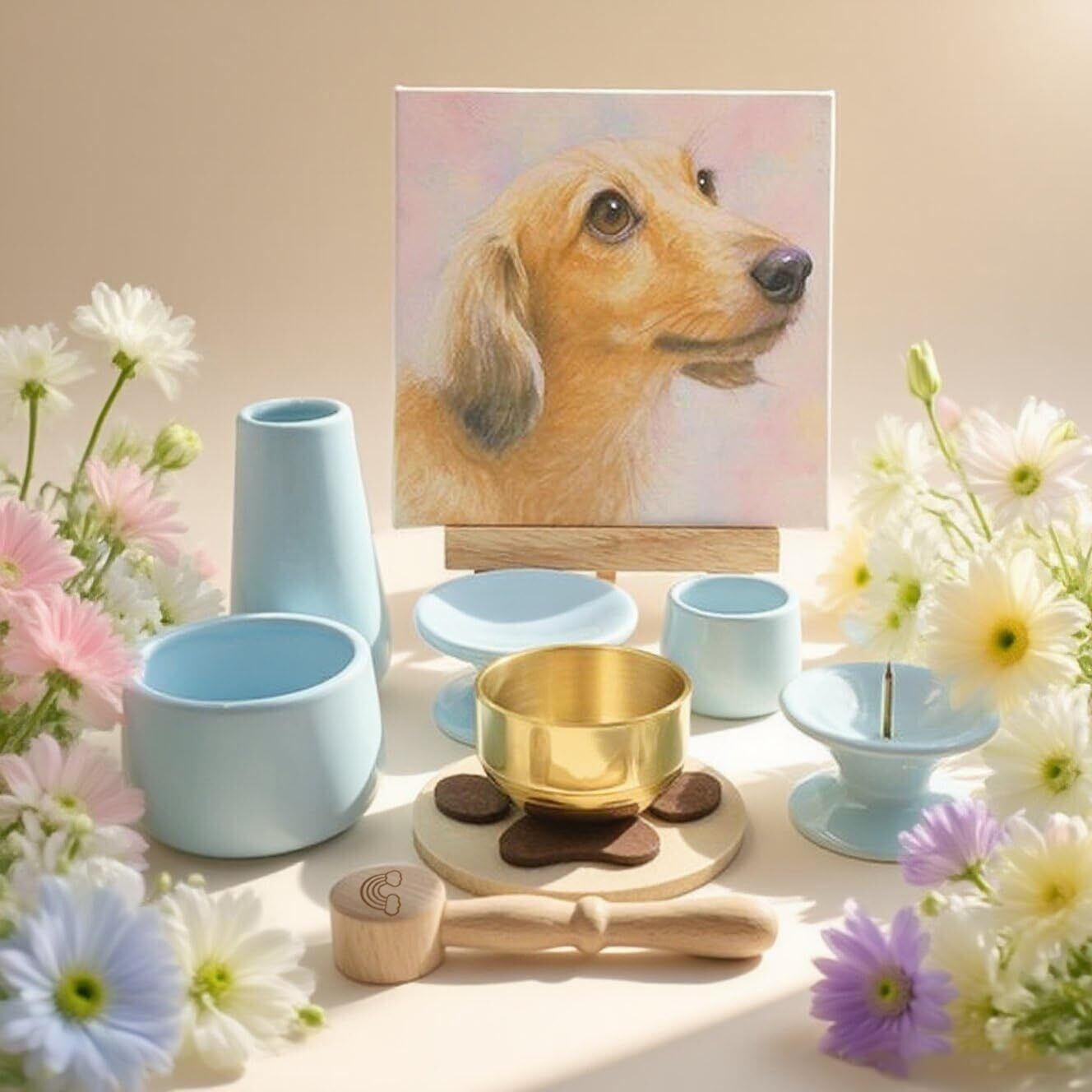 「大切なペットちゃんへの想いを形に」 ペット供養・メモリアル台・遺骨ペンダントの横に添えて。初めての供養にもおすすめのやさしいデザインの仏具セットです。
