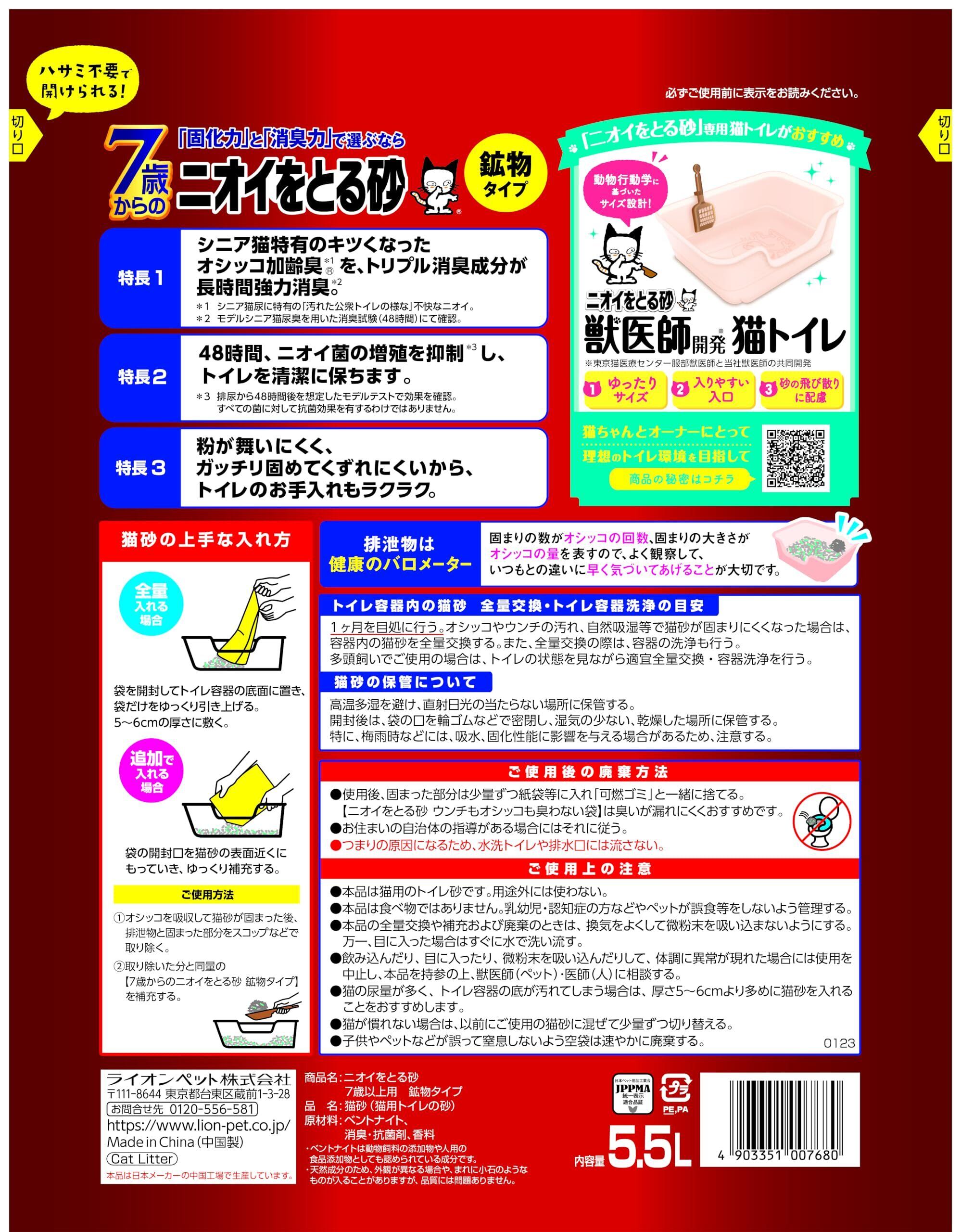 ライオン ニオイをとる砂 猫砂 7歳以上用鉱物タイプ 5.5Lx4袋 ケース販売 LIONPET