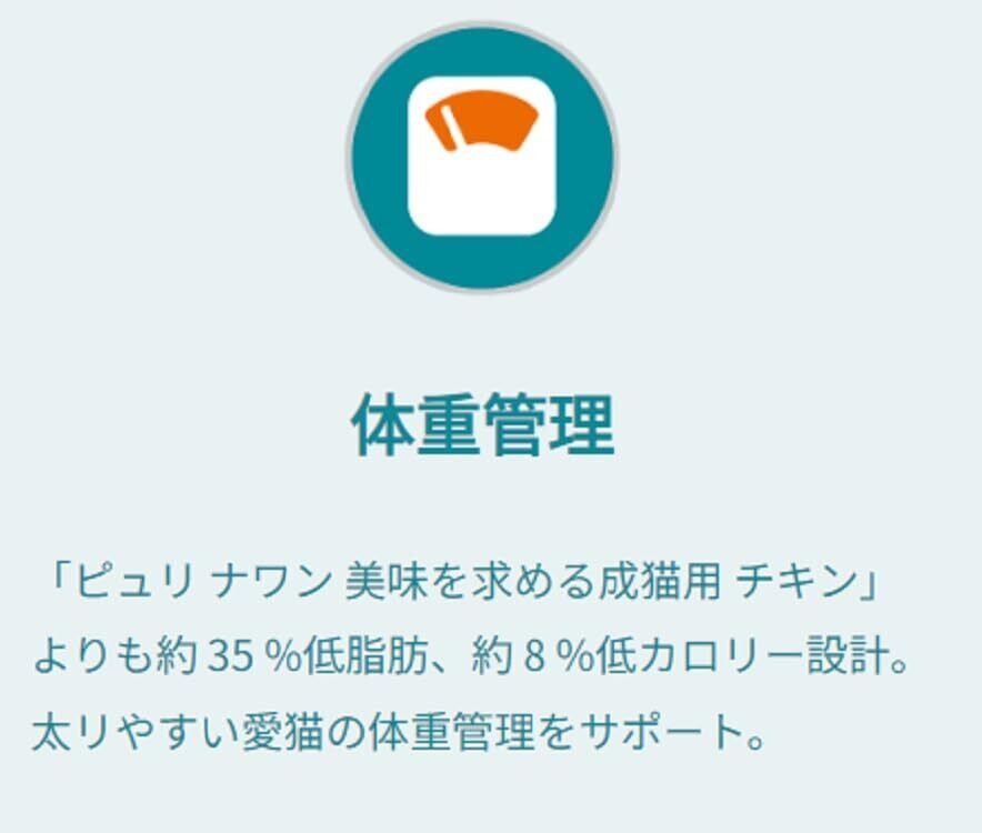 太り気味の猫のダイエットをサポート。高食物繊維設計で満腹感を維持。脂肪とカロリーを減らしたフードの設計で代謝エネルギーをコントロールして体重管理。Lーカルニチン配合。