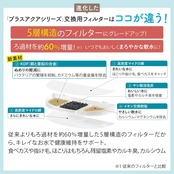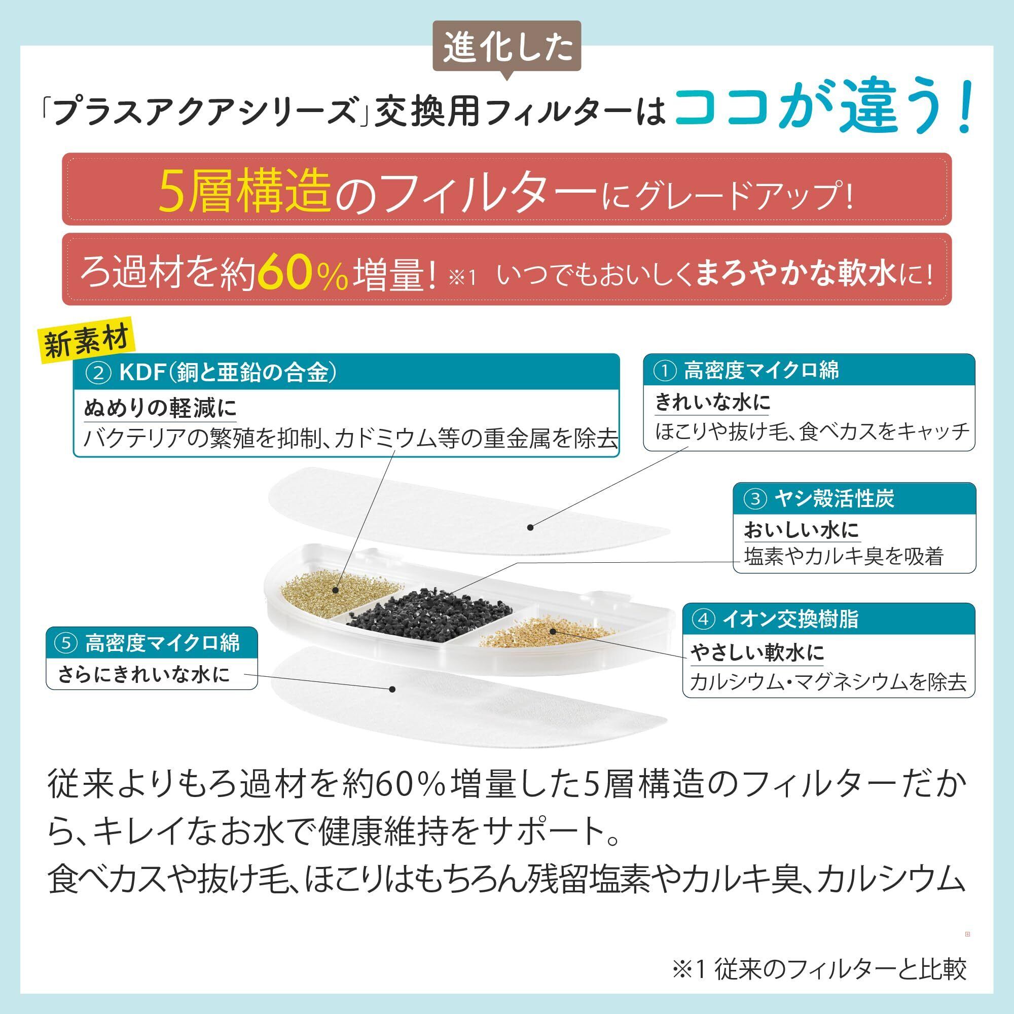 進化したプラスアクアシリーズ交換用フィルターはココが違う! 5層構造のフィルターにグレードアップ!・ろ過材を約60%増量!いつでもおいしくまろやかな軟水に! 新素材KDF(銅と亜鉛の合金)はバクテリアの繁殖を抑制するのでぬめりの軽減に!さらにカドミウムなどの重金属を除去 従来のフィルターよりもキレイなお水で健康維持をサポート