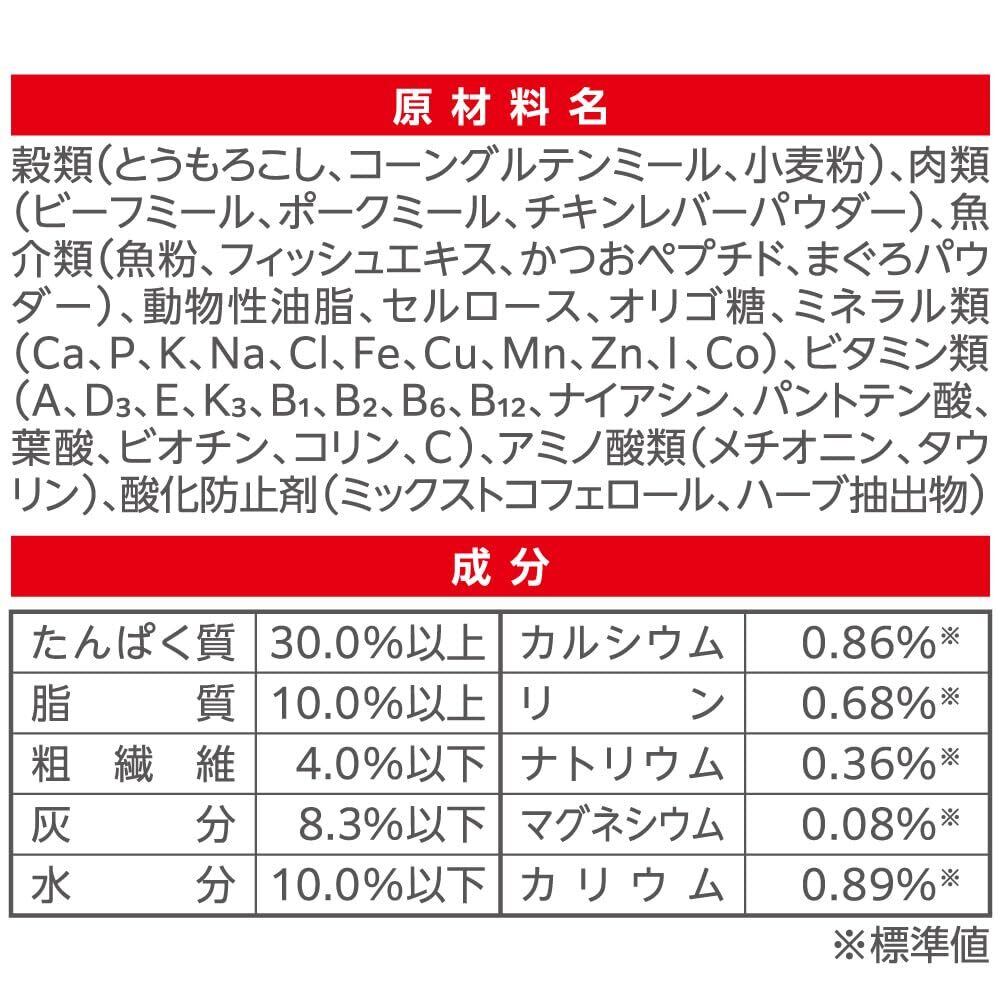 【原材料】 穀類(とうもろこし、コーングルテンミール、小麦粉)、肉類(ビーフミール、ポークミール、チキンレバーパウダー)、魚介類(魚粉、フィッシュエキス、かつおペプチド、まぐろパウダー)、動物性油脂、オリゴ糖、ミネラル類(Ca、P、K、Na、Cl、Fe、Cu、Mn、Zn、I、Co)、ビタミン類(A、D3、E、K3、B1、B2、B6、B12、ナイアシン、パントテン酸、葉酸、ビオチン、コリン、C)、アミノ酸類(メチオニン、タウリン)、酸化防止剤(ミックストコフェロール、ハーブ抽出物) 【成分】 たんぱく質:30.0%以上、脂質:10.0%以上、粗繊維:4.0%以下、灰分:8.5%以下、水分:10.0%以下 【エネルギー】 350kcal/100g