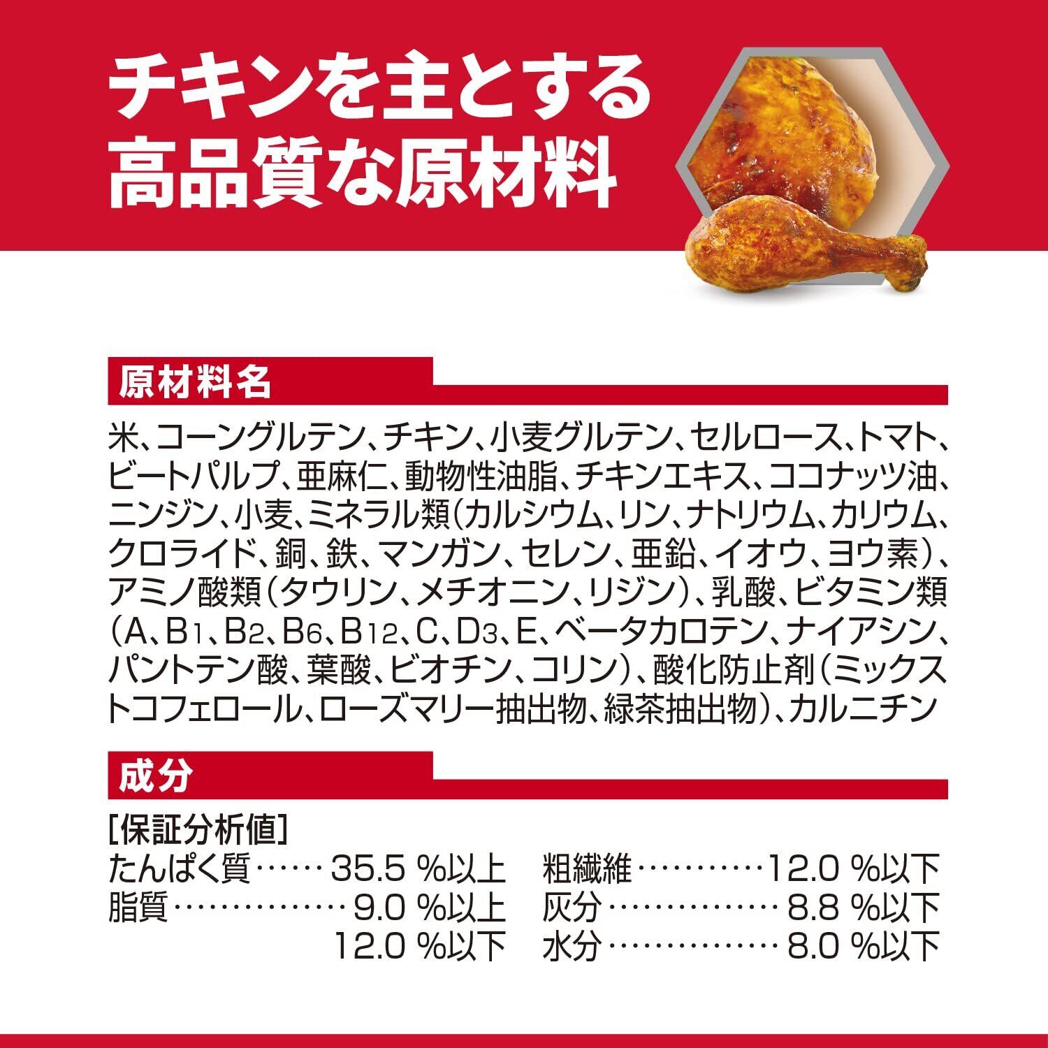 米、コーングルテン、チキン、小麦グルテン、セルロース、トマト、ビートパルプ、亜麻仁、動物性油脂、チキンエキス、ココナッツ油、ニンジン、小麦、ミネラル類(カルシウム、リン、ナトリウム、カリウム、クロライド、銅、鉄、マンガン、セレン、亜鉛、イオウ、ヨウ素)、アミノ酸類(タウリン、メチオニン、リジン)、乳酸、ビタミン類(A、B1、B2、B6、B12、C、D3、E、ベータカロテン、ナイアシン、パントテン酸、葉酸、ビオチン、コリン)、酸化防止剤(ミックストコフェロール、ローズマリー抽出物、緑茶抽出物)、カルニチン