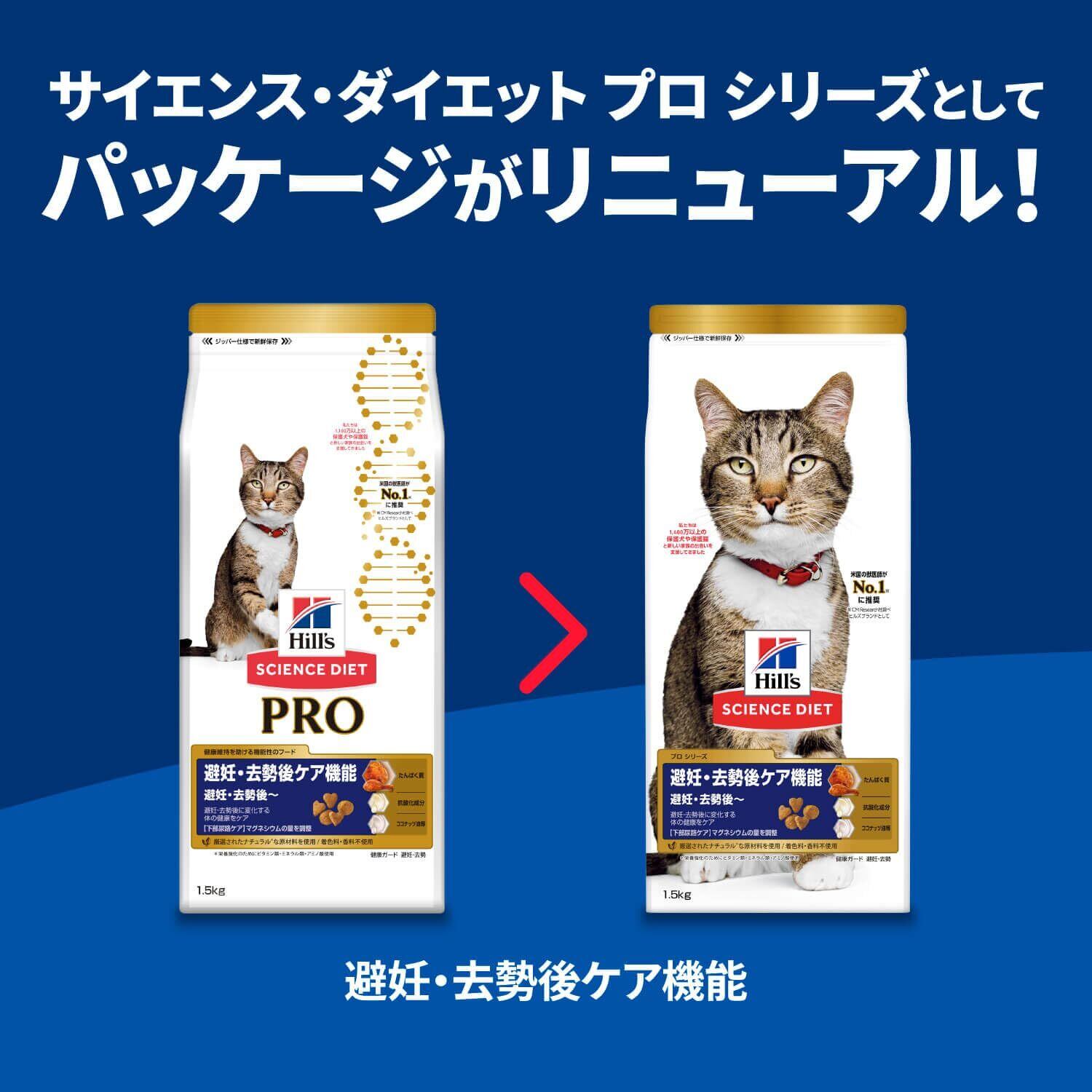 病気をよせつけない免疫力を。避妊・去勢後にこそ必要なケアがあります。ヒルズ サイエンス・ダイエット〈プロ〉猫用 【避妊・去勢後ケア機能】は、愛猫の避妊・去勢後の健康を長期的に栄養素でサポートする総合栄養食「機能性健康食」です。愛猫本来の健康な免疫力を維持するのを助ける、科学的根拠に裏付けされた抗酸化成分(ビタミンE+C)のほか、健康な代謝の維持をサポートする、ココナッツ油・亜麻仁・ニンジン・トマトの独自の栄養配合や、カロリーを抑え健康的な理想の体重の維持をサポートする、食物繊維が豊富に含まれたキャットフードです。また、たんぱく質とカルニチンが活動量低下による筋肉の衰えに対応し、健康に保ちます。
