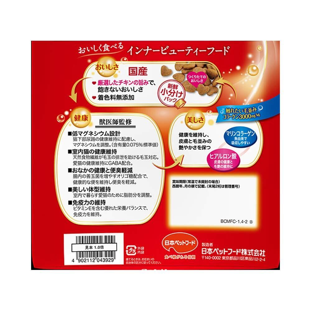 「実感が欲しい、あなたへ」獣医師監修のビューティープロ。皮膚の健康と毛艶の維持にマリンコラーゲン3000mg/kg、ヒアルロン酸配合。ストルバイト結石に配慮し、マグネシウムを0.075%(標準値)に調整。さらに、pHコントロールし、メチオニン強化。1歳からの室内猫に適した栄養素を含むチキン味。天然食物繊維が毛玉の排泄を助ける毛玉対応。着色料無添加、食べやすいハート型。新鮮小分け280g×5袋。